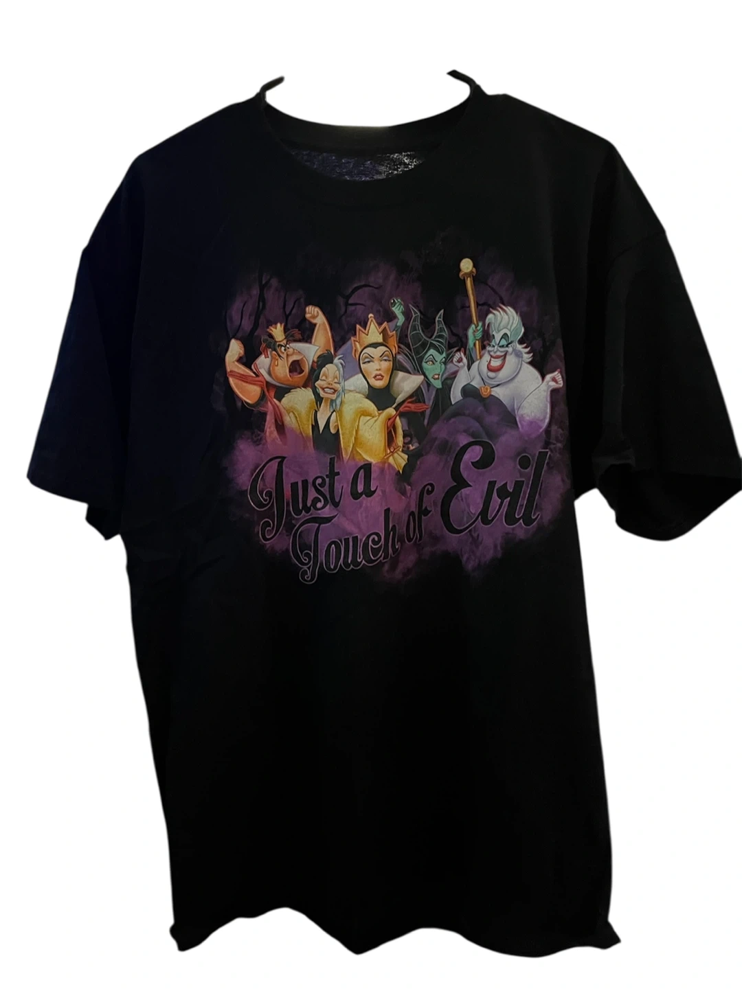 I'm selling a Disney Villains t-shirt in size XL/XG (16/18). It's made of 100% cotton and features a "Just a Touch of Evil" design. This shirt is in great condition!