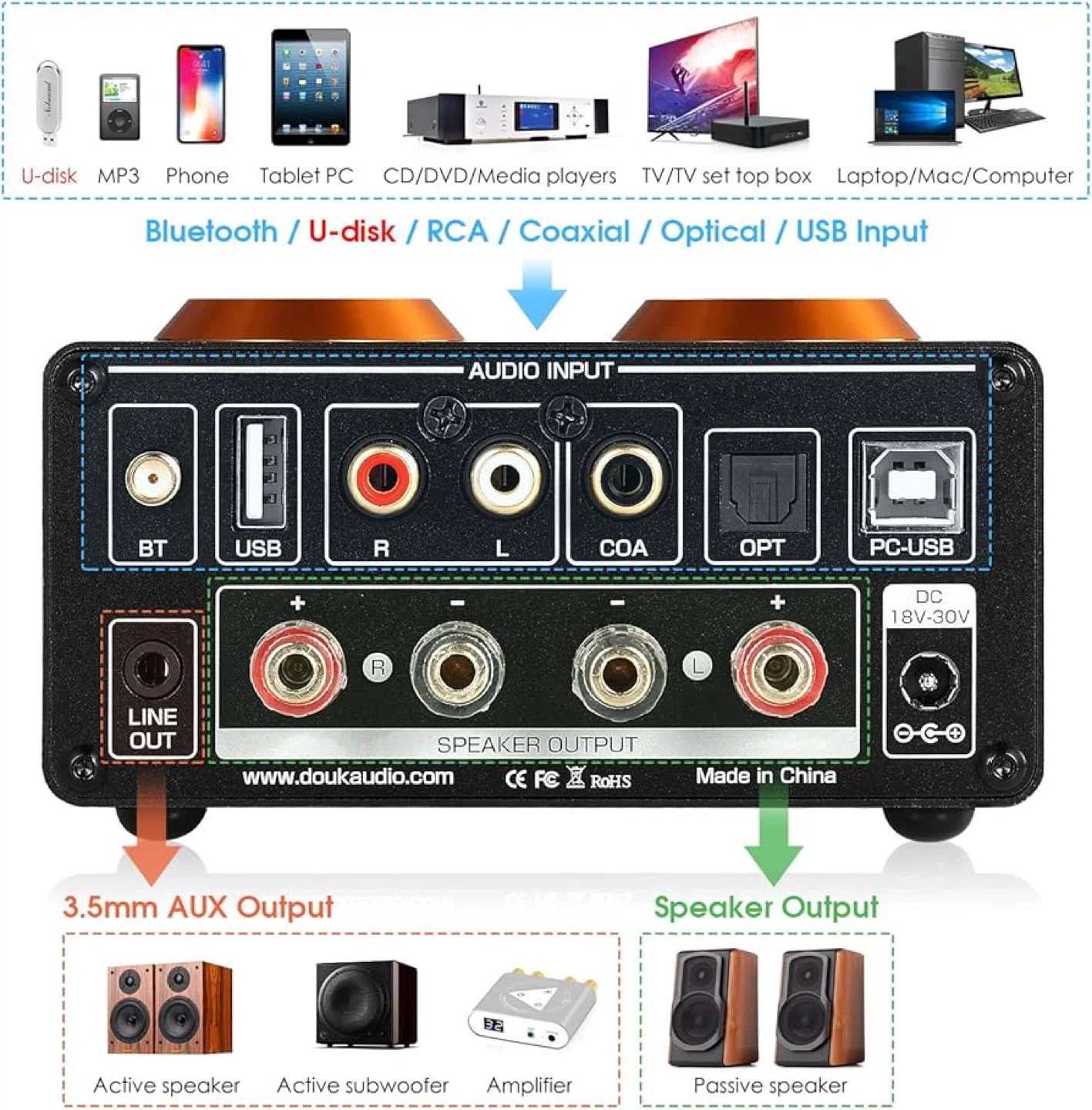 The amplifier has multiple inputs including Bluetooth, U-disk, RCA, Coaxial, Optical, and USB