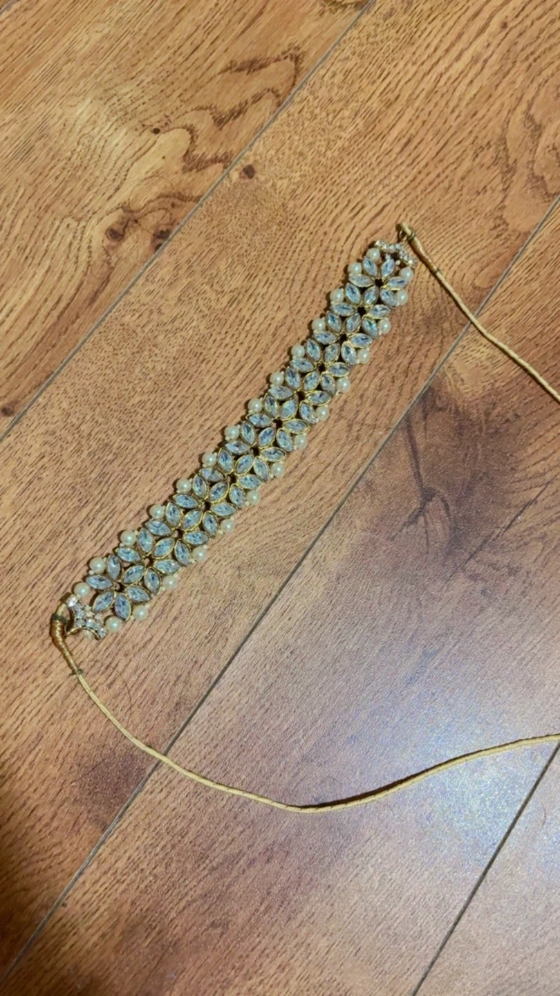 This is a beautiful choker necklace featuring pearls and crystals. It's in great condition and would be a lovely addition to any outfit! The necklace has a tie closure with a tassel.
