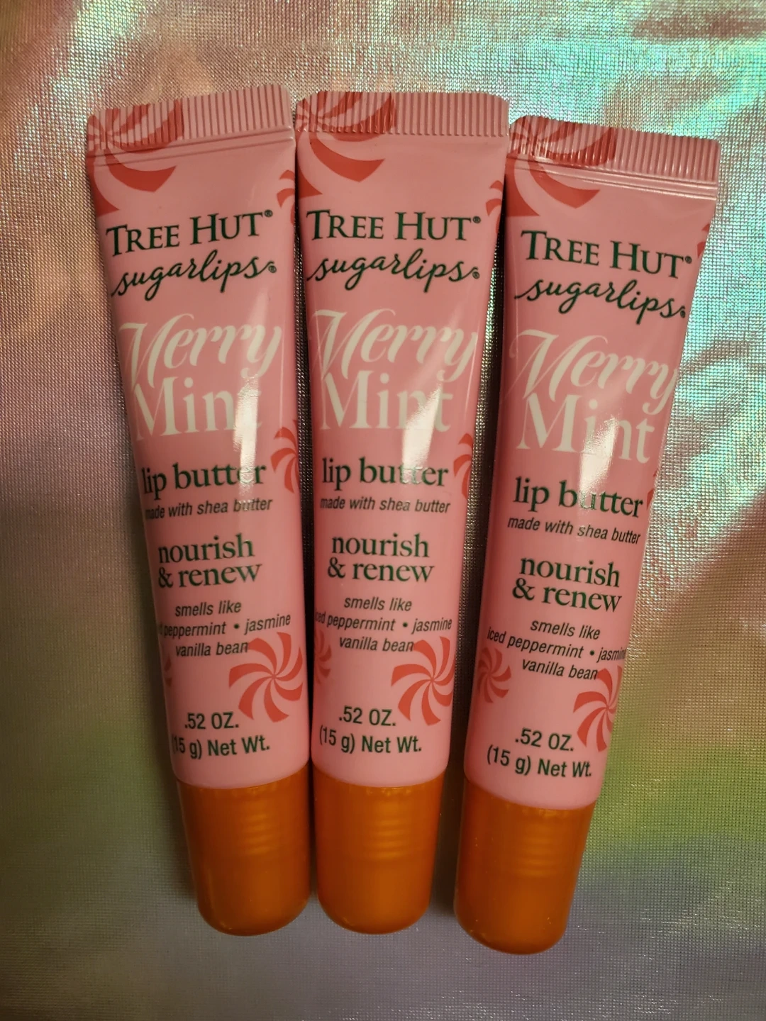 I'm selling three Tree Hut Sugarlips Merry Mint lip butters! Each tube is .52 oz (15g) net weight. These lip butters are made with shea butter and smell like peppermint, jasmine, and vanilla bean, so they nourish and renew your lips. All brand new and unused.