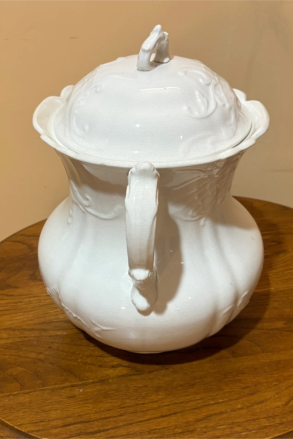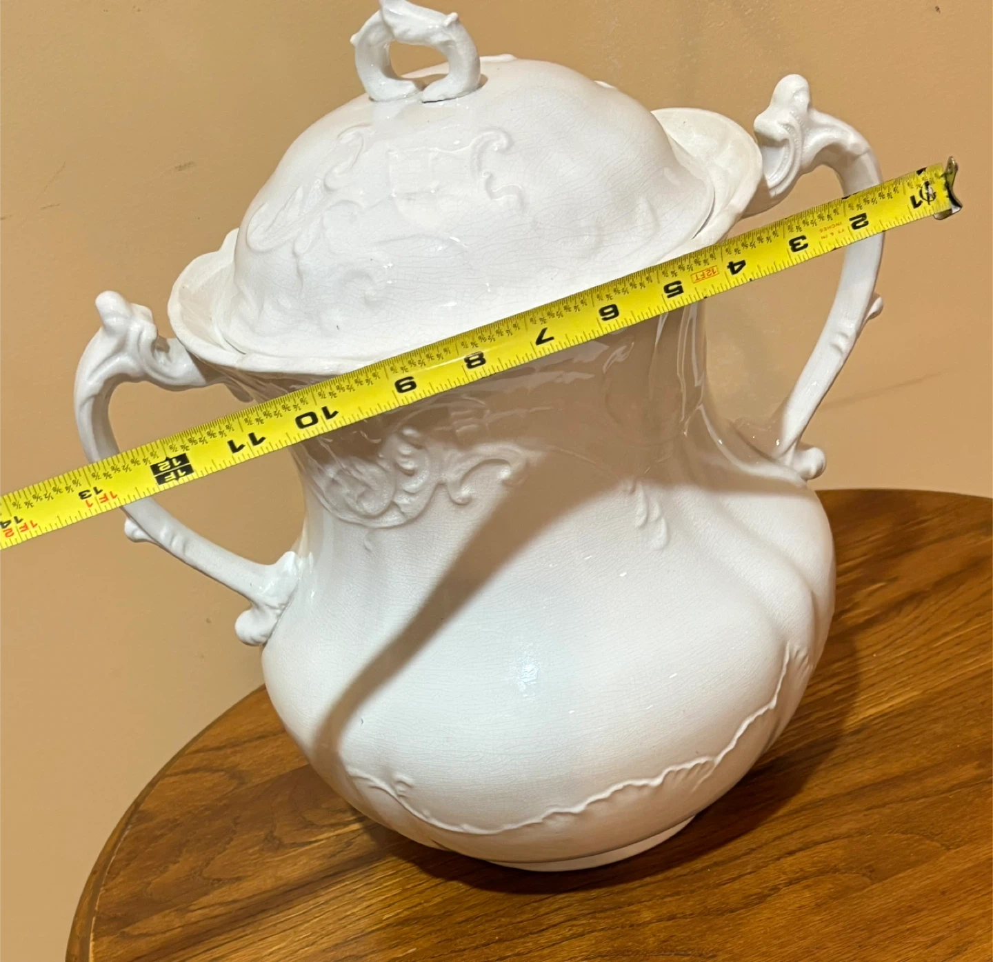 I'm selling a lovely Antique Dresden white porcelain pitcher with a lid. It stands approximately 16 inches tall and 16 inches wide. It has a classic design with ornate handles and detailing on the lid and body. It would make a beautiful addition to any home!