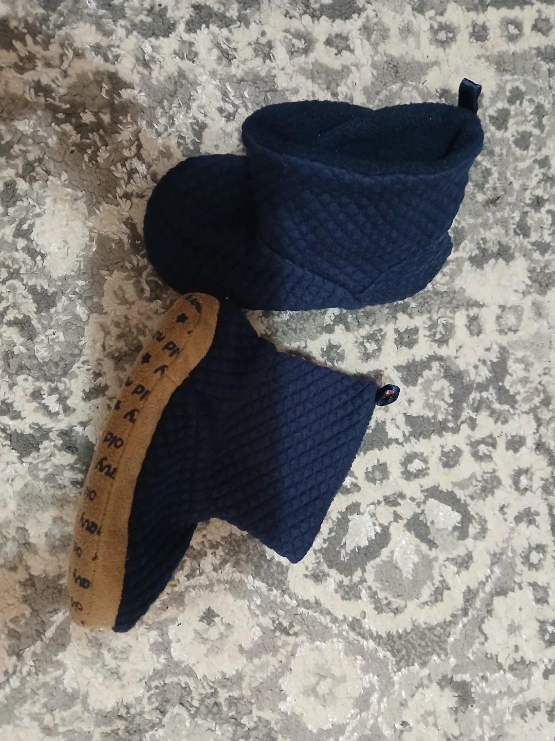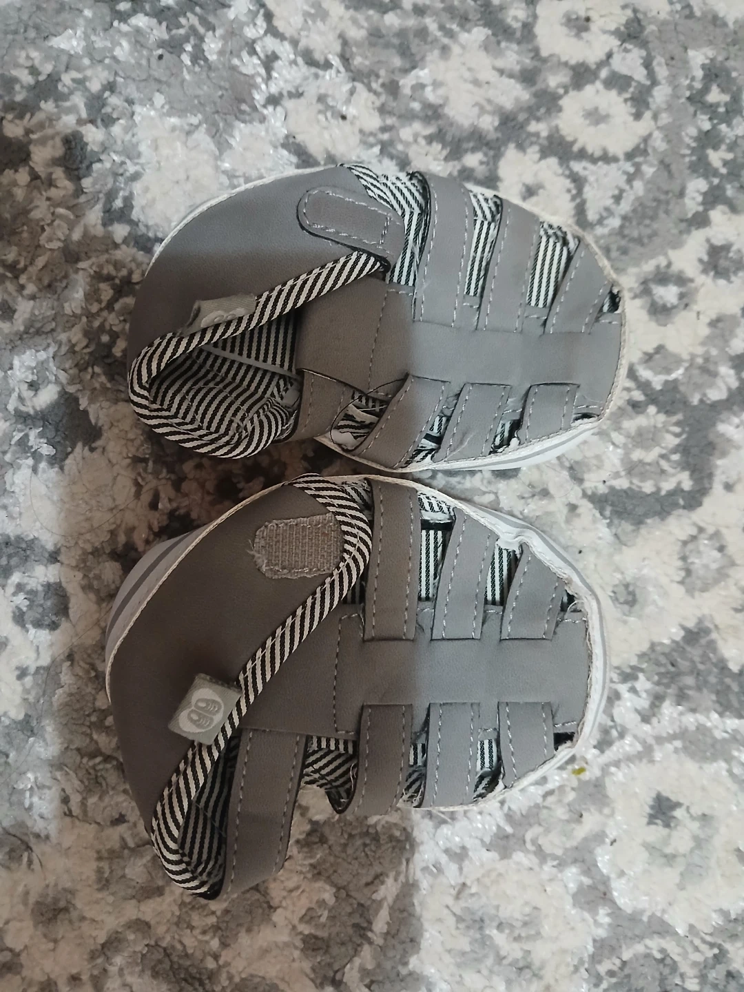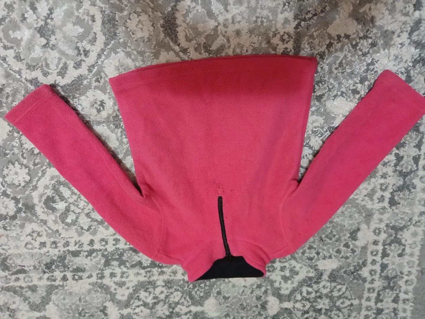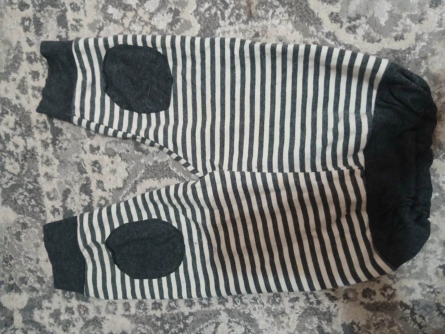 Selling a bundle of baby and toddler clothing. Includes a pair of striped pants with knee patches, a striped hoodie, a t-shirt with a cat design, a pink fleece jacket, and a pair of blue slippers. Great for a growing child!