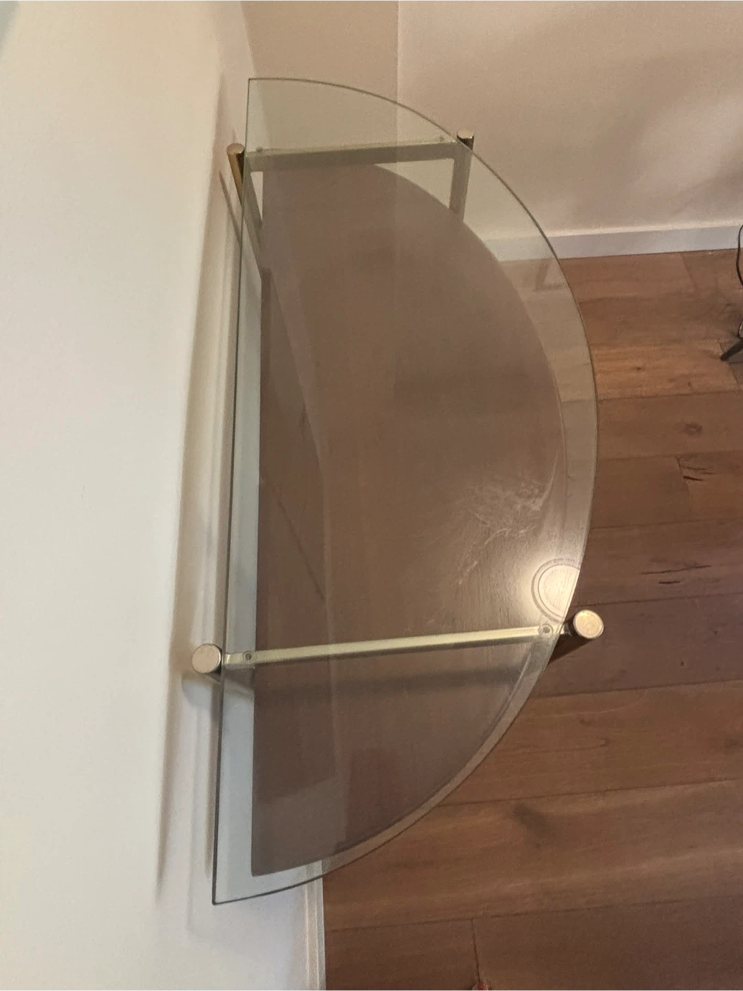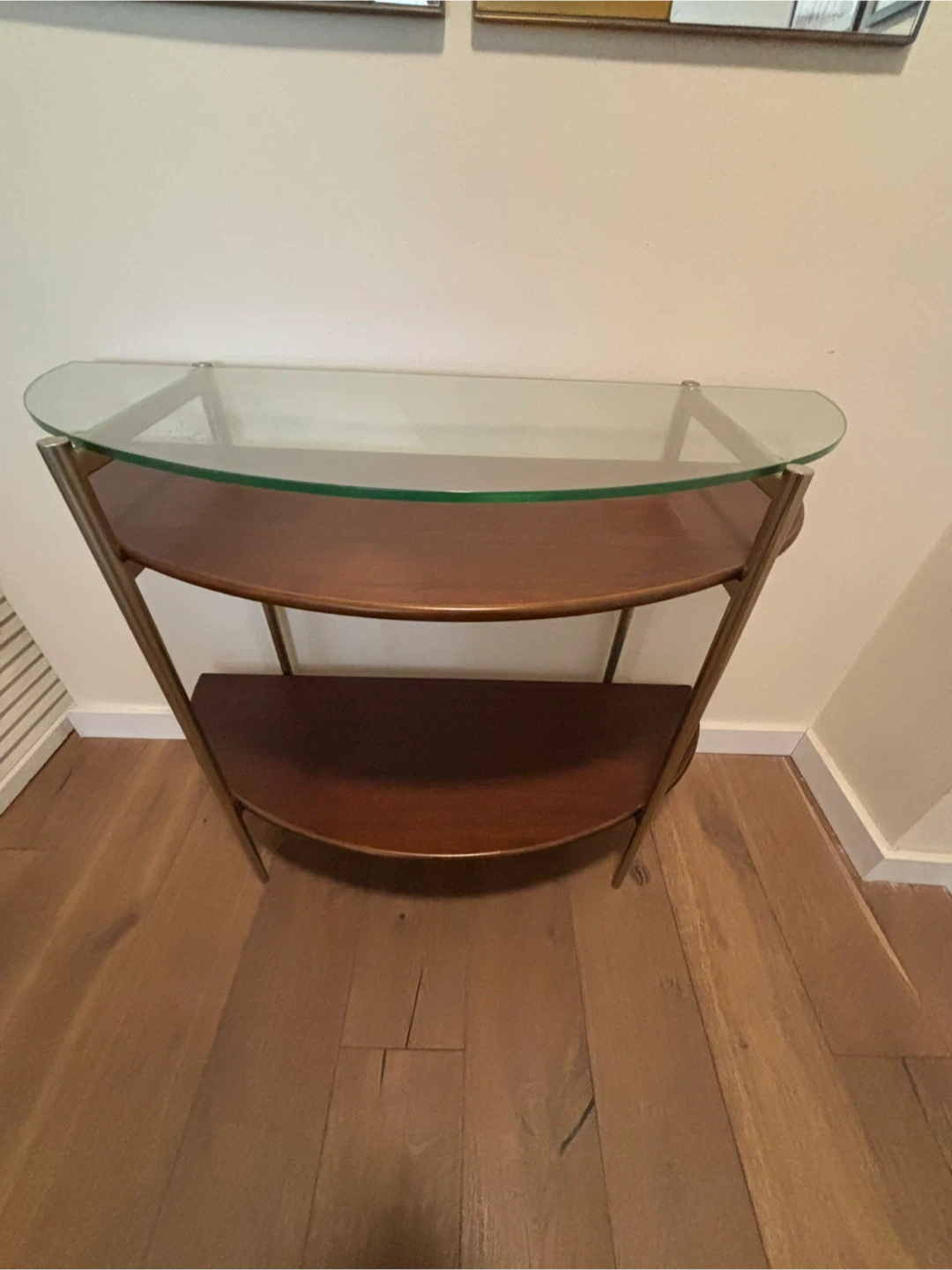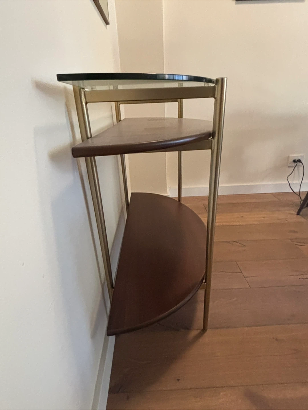 It features a glass top and wooden shelves, perfect for adding a touch of elegance to any room. The gold-tone frame adds a modern touch to this unique piece of furniture