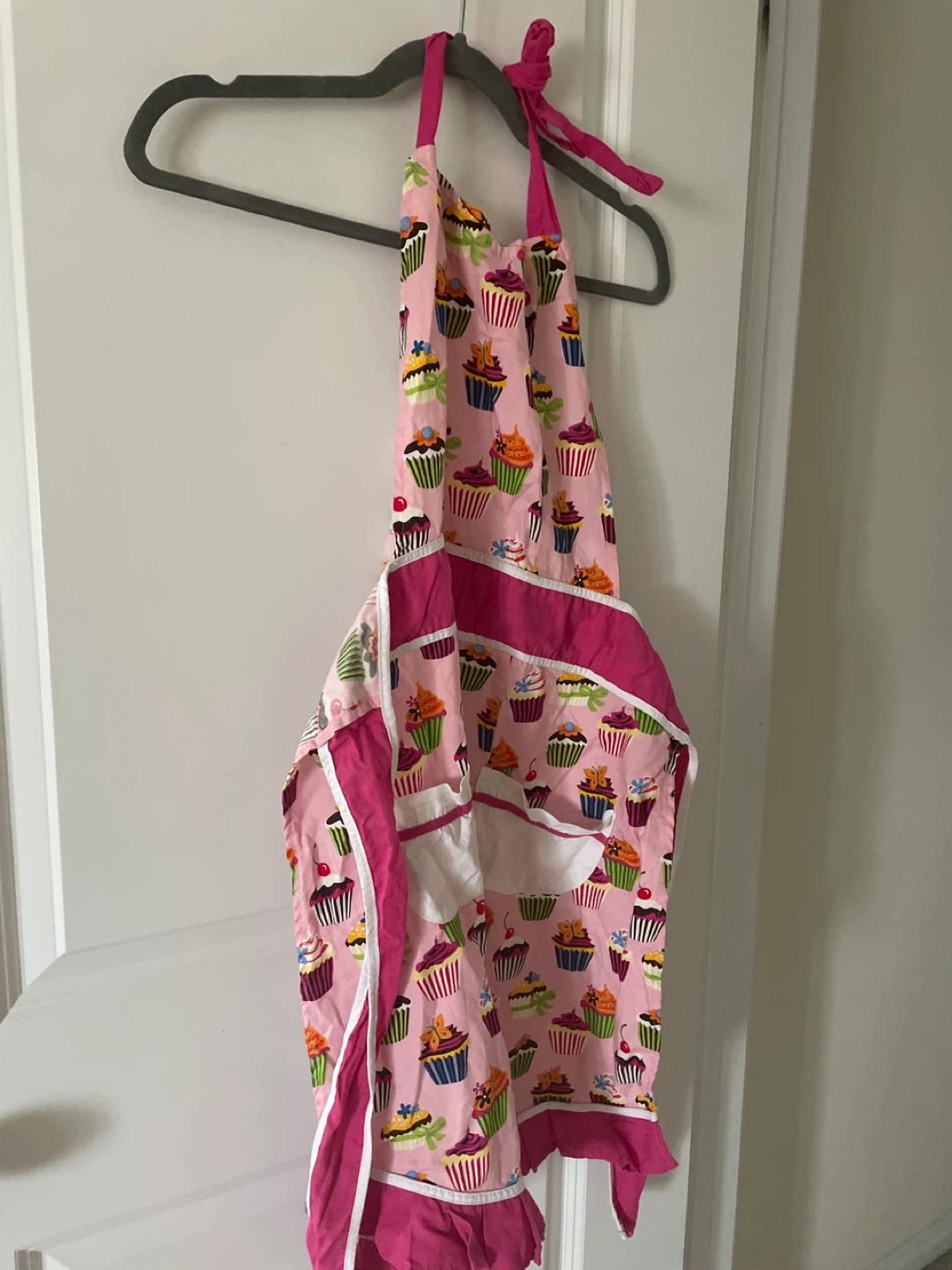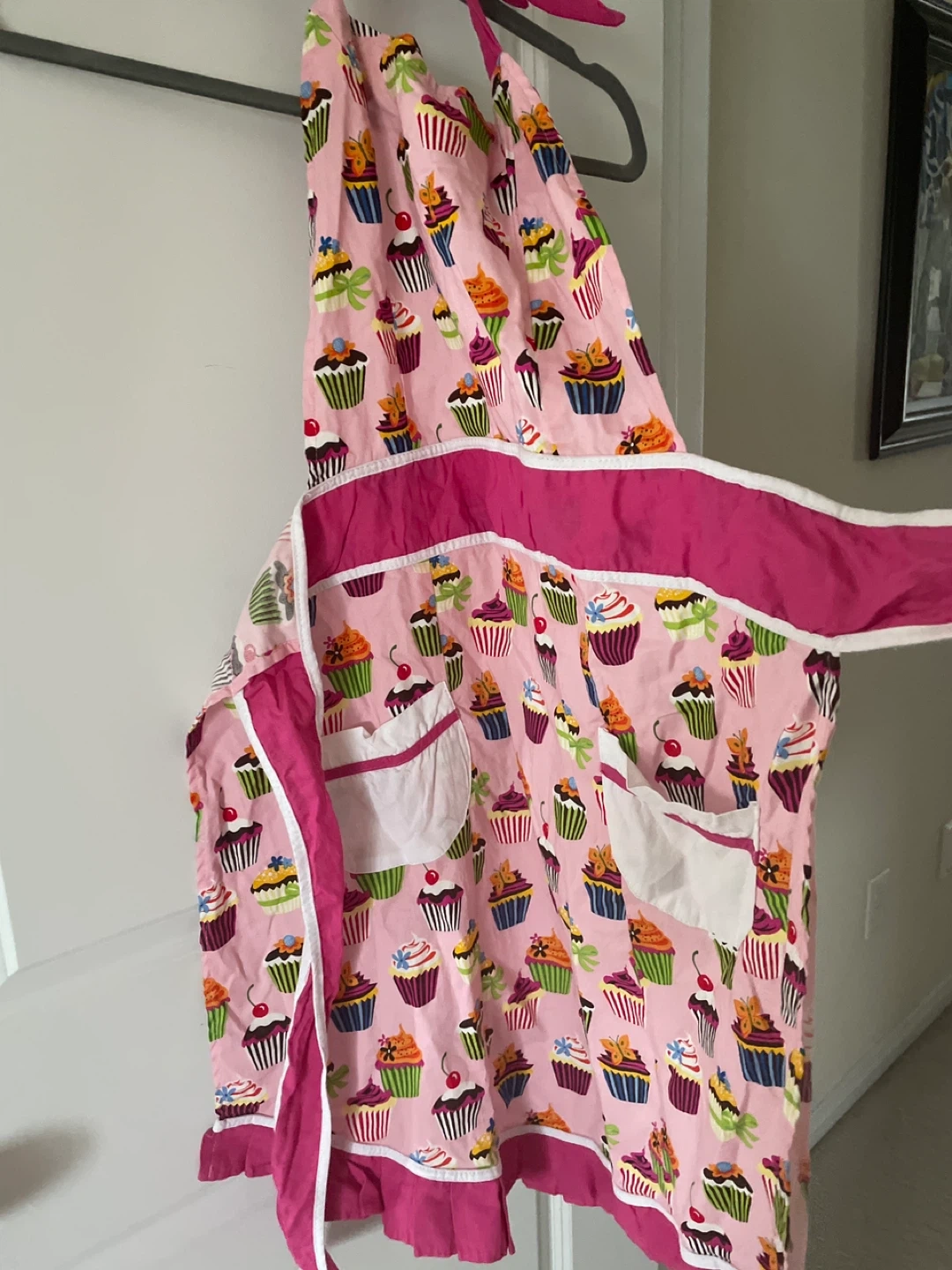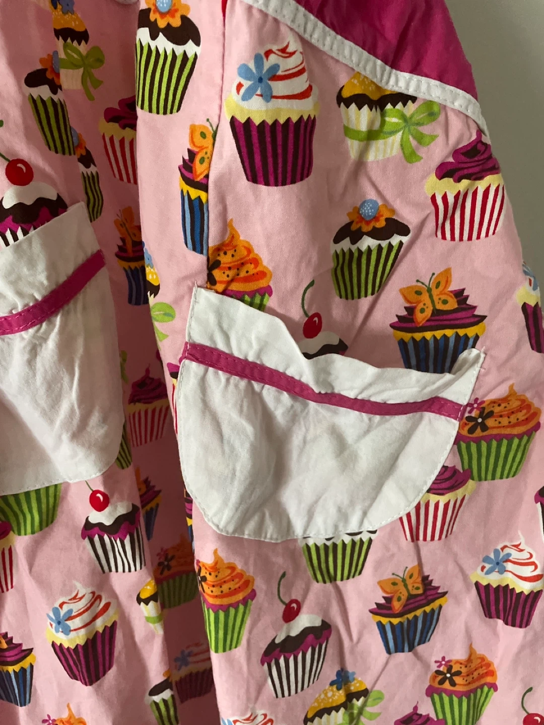 This is a super cute apron with a fun cupcake print! It's pink with colourful cupcakes and has handy pockets. Perfect for baking or cooking in style!