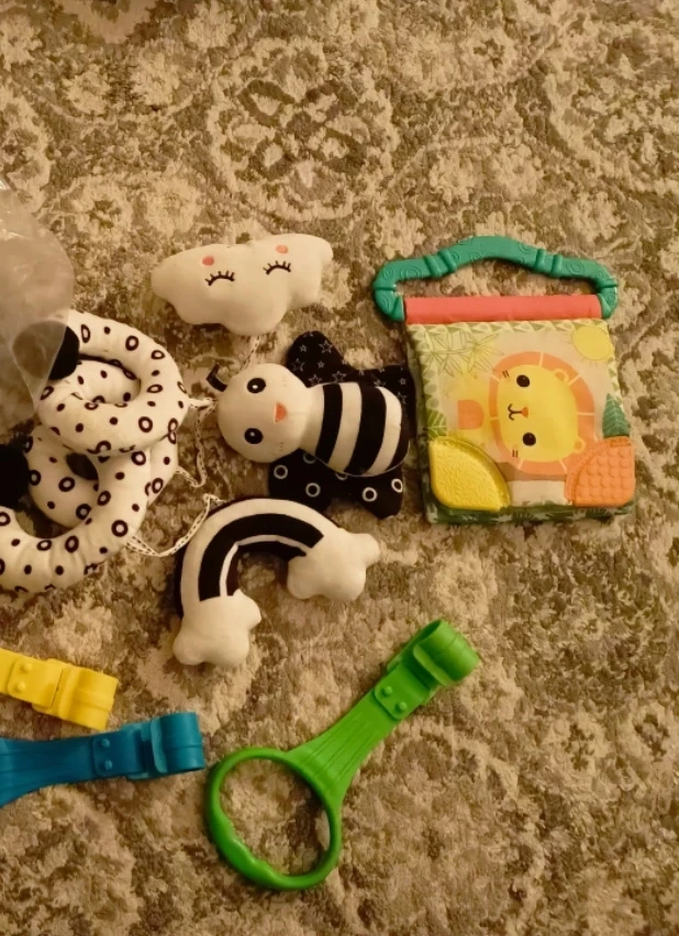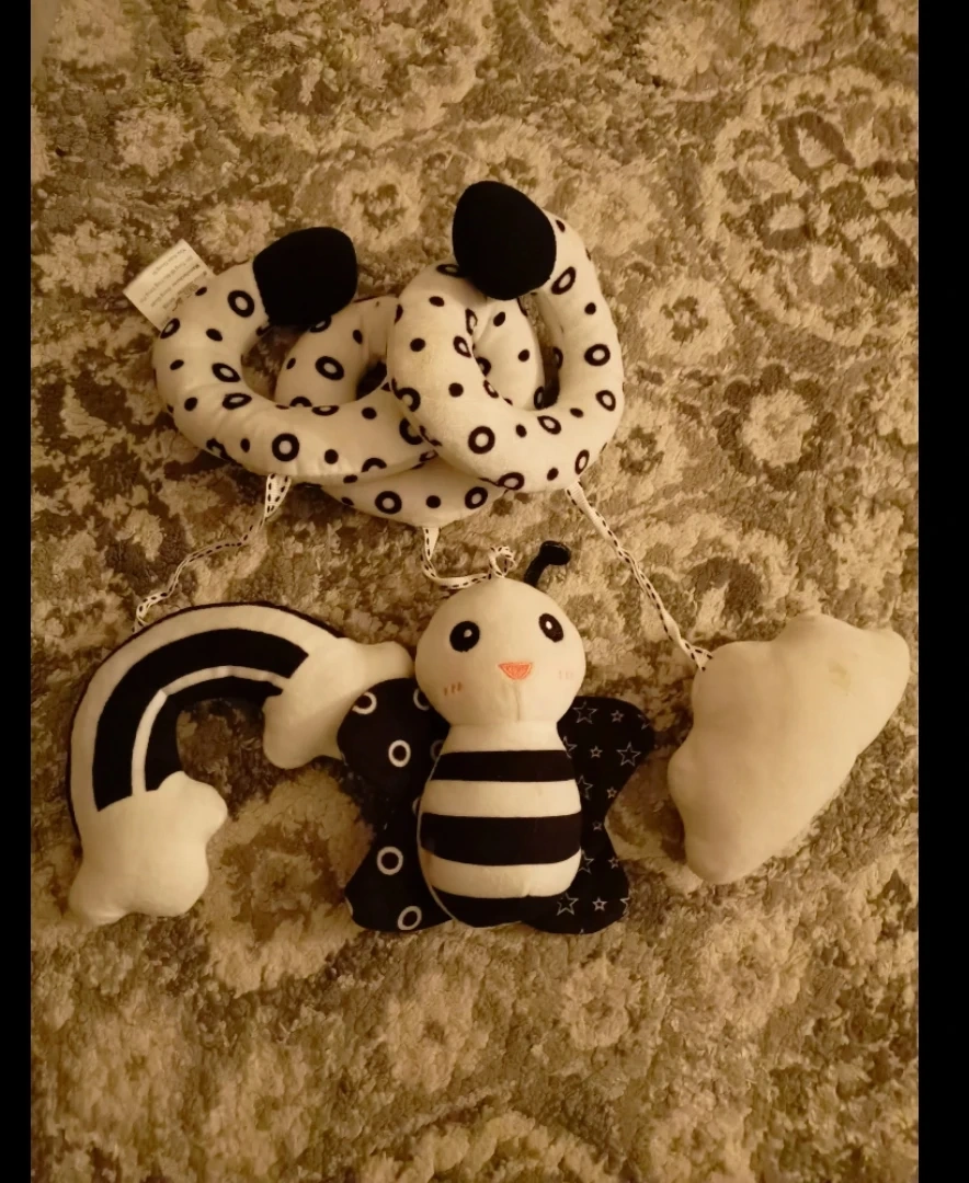 Selling a cute Infantino black and white sensory toy set! This set is perfect for stimulating your baby's senses with its contrasting colors and textures. Includes a variety of toys like a soft book and plush attachments. Great for tummy time and early development