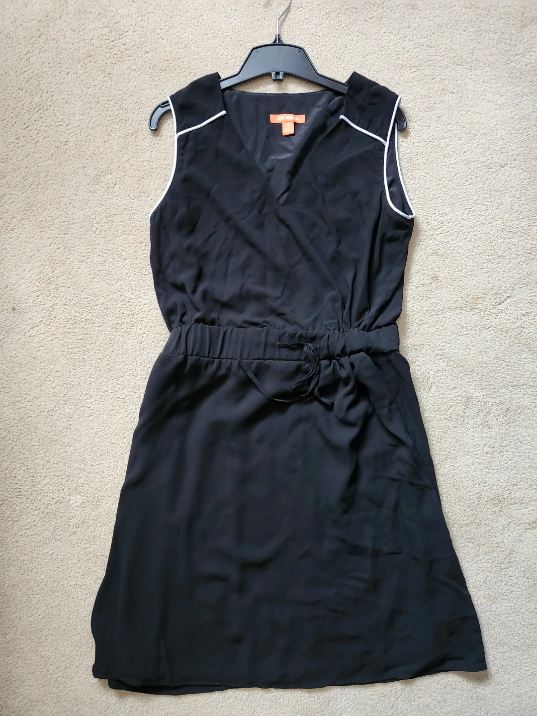 Here's a lovely black dress from Joe Fresh! It's a size medium and features a flattering V-neck design. The dress has a comfortable elastic waistband with a drawstring tie. Perfect for a casual day out or dressed up for an evening occasion