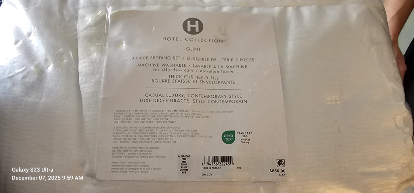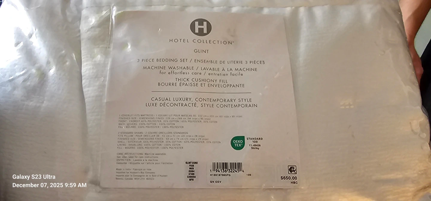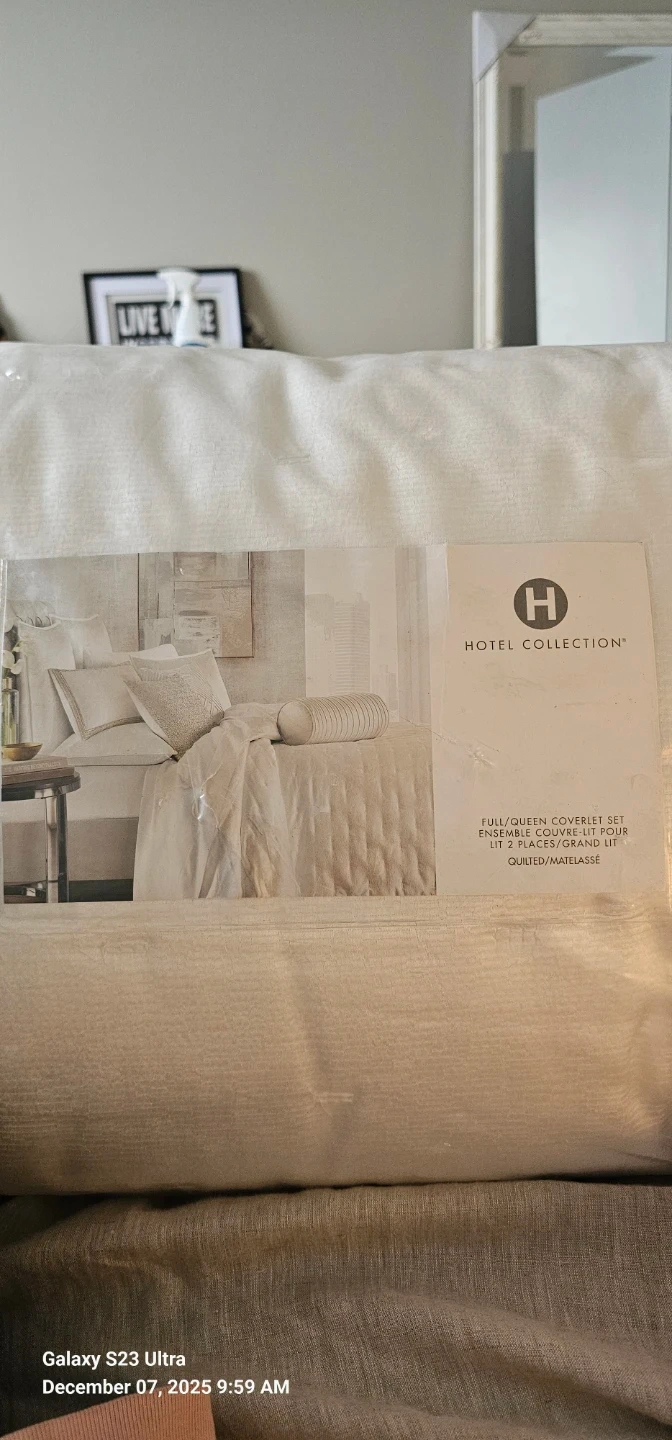 Selling a Hotel Collection Glint 3-piece bedding set in queen size! It's machine washable and has a thick, cushiony fill. The set includes a coverlet and two standard shams. The coverlet is a luxuriously soft blend of 53% cotton and 47% polyester. The shams are 100% cotton.