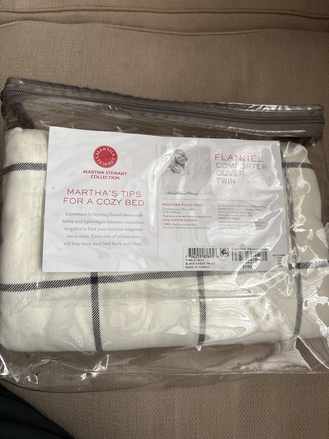 Selling a brand new Martha Stewart Collection flannel comforter cover in twin size. It's the Montana Plaid Onyx design, made from 100% cotton flannel. The original price was $100. It is still in its original packaging.
