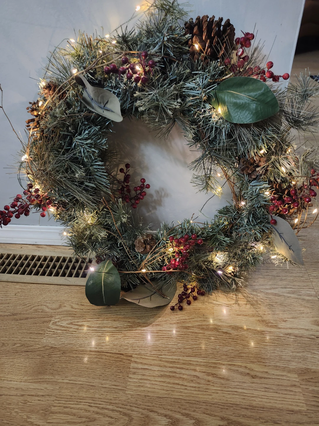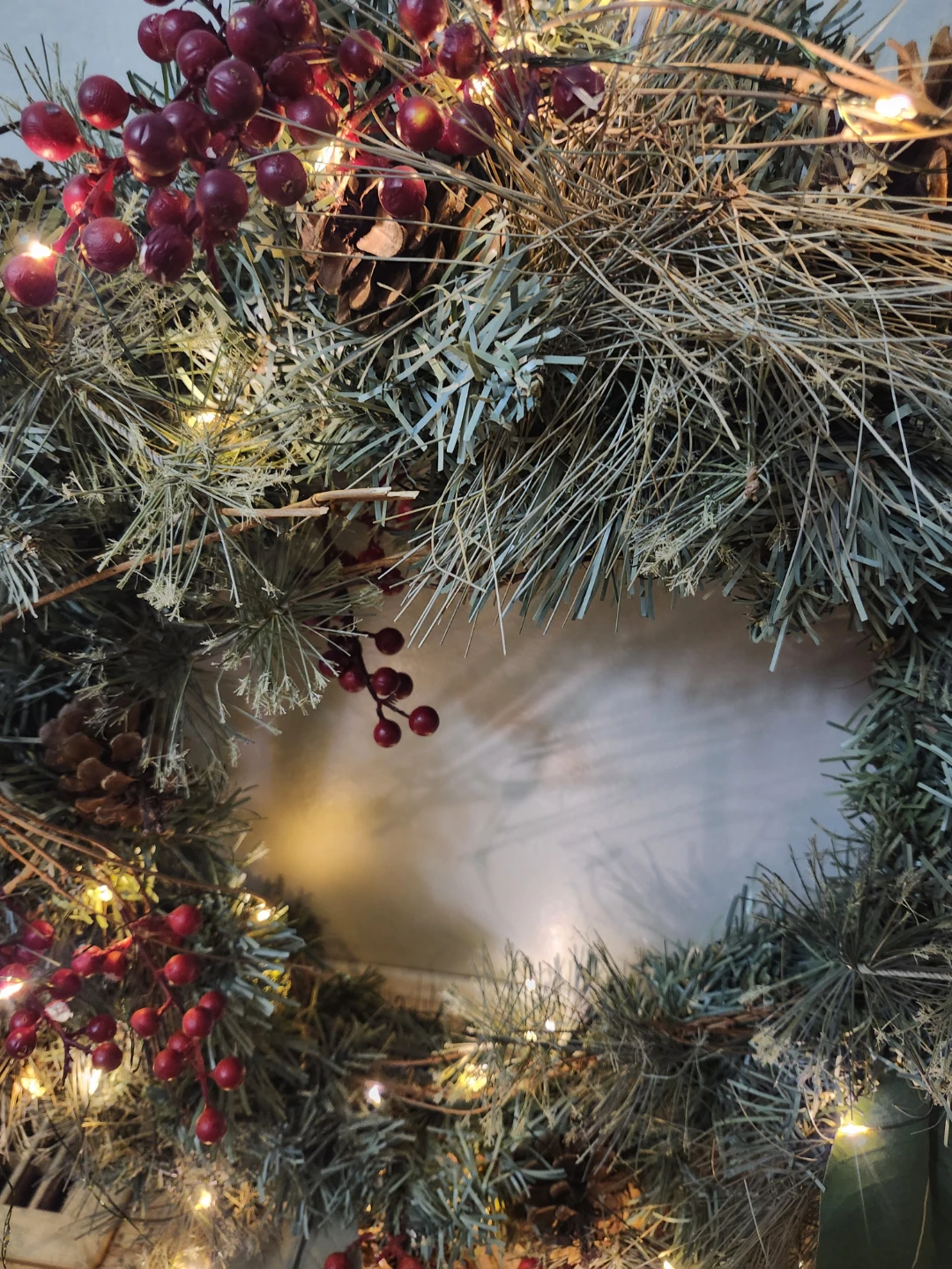 Festive Christmas wreath with pine needles, pine cones, red berries, and leaves. It's also decorated with string lights to add a warm glow to your home during the holidays!