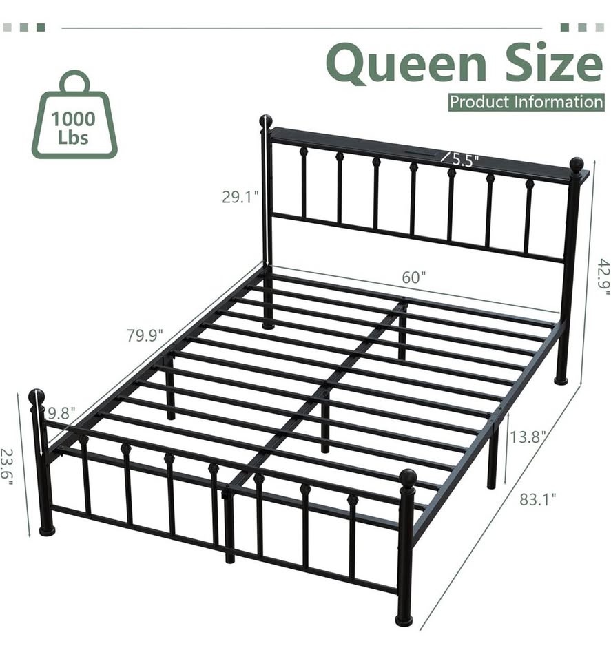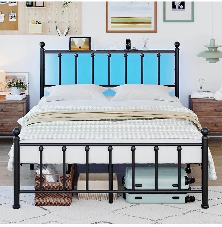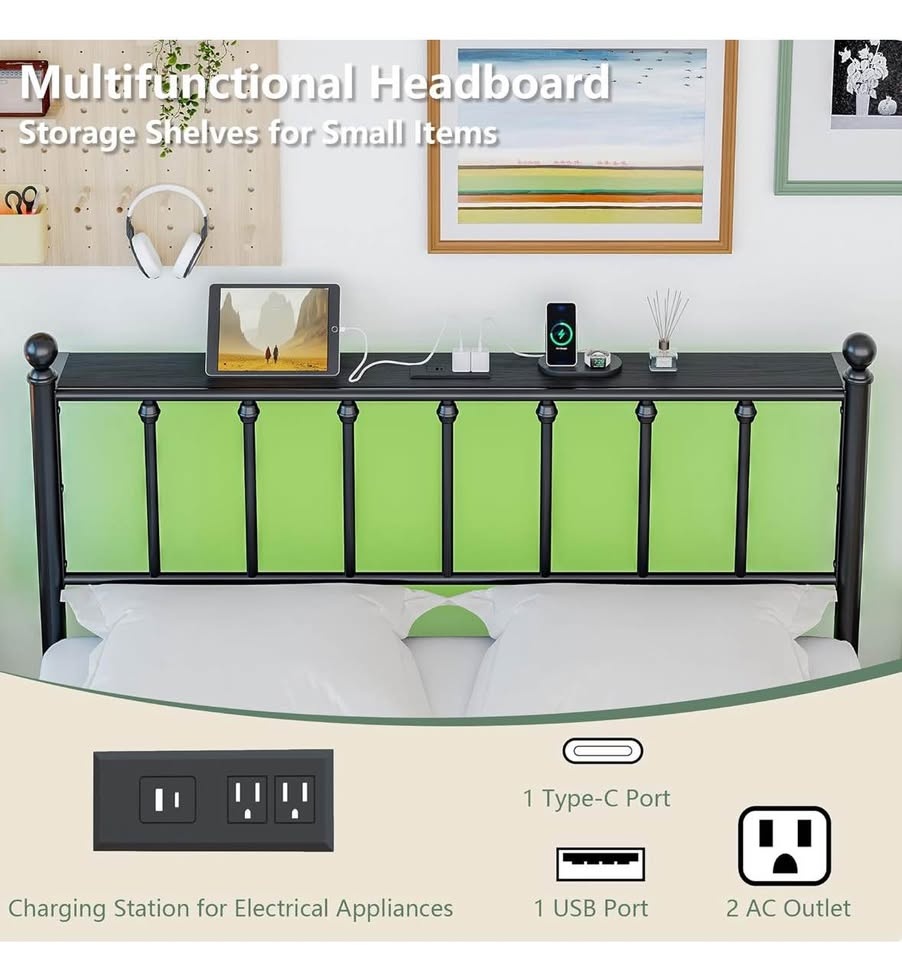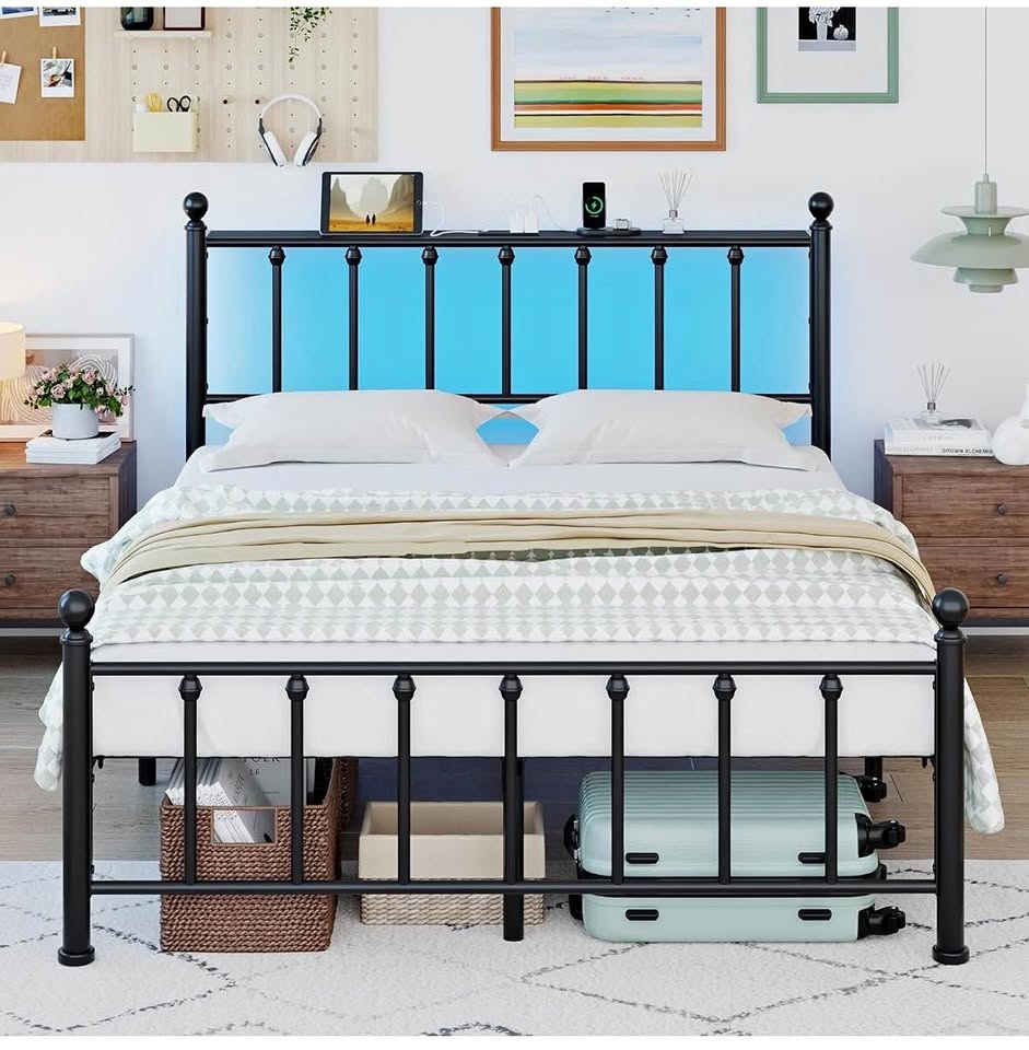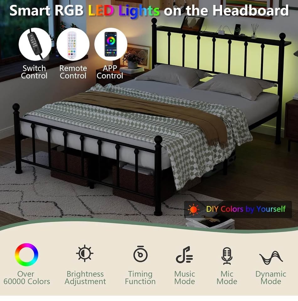 This queen size platform bed frame is crafted with sturdy metal slats and 9 thick legs, supporting up to 1000 lbs. The headboard/footboard feature elegant cast metal scrollwork and smooth polished surfaces. Built-in RGB LED light strips under the headboard offer 60,000+ color options, controllable via APP, remote, or switch. The headboard also has a charging station: 1 Type-C, 1 USB, and 2 outlets. The headboard has a built-in storage shelf, and 12.5” under-bed clearance offers extra storage space. The bed frame has strong and durable steel slats and stays quiet and shake-free.