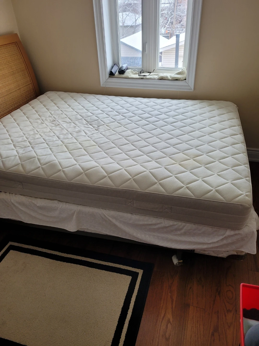I have a queen matress and frame.The matress is only a couple years old and is good condition no stains or spots. The frame is older from peir one but is very sturdy and has wheel so can move easier. Very handy 👌