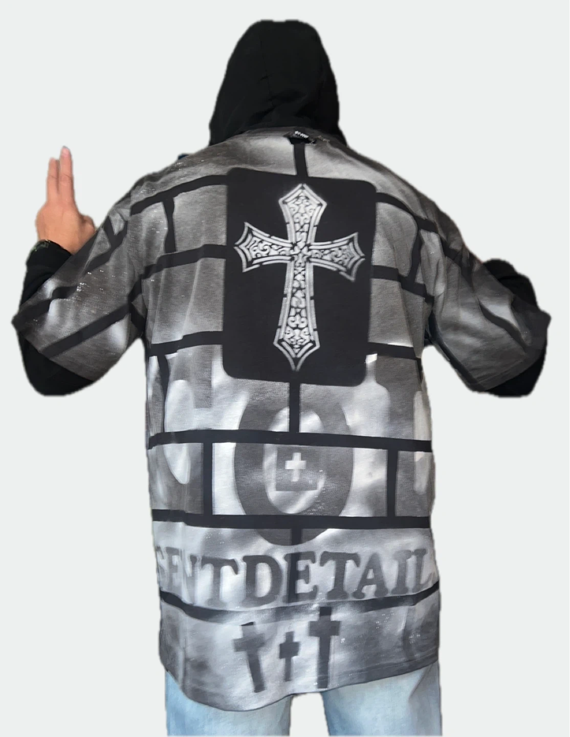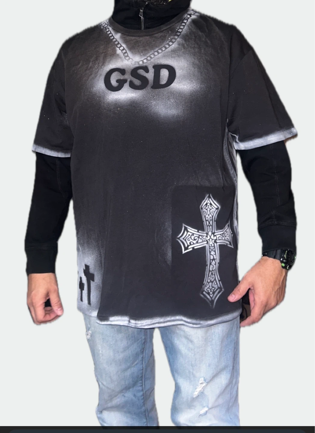 Unique GSD graphic print t-shirt with a bold design. The shirt features crosses and other graphic details on both the front and back. Great for making a statement!