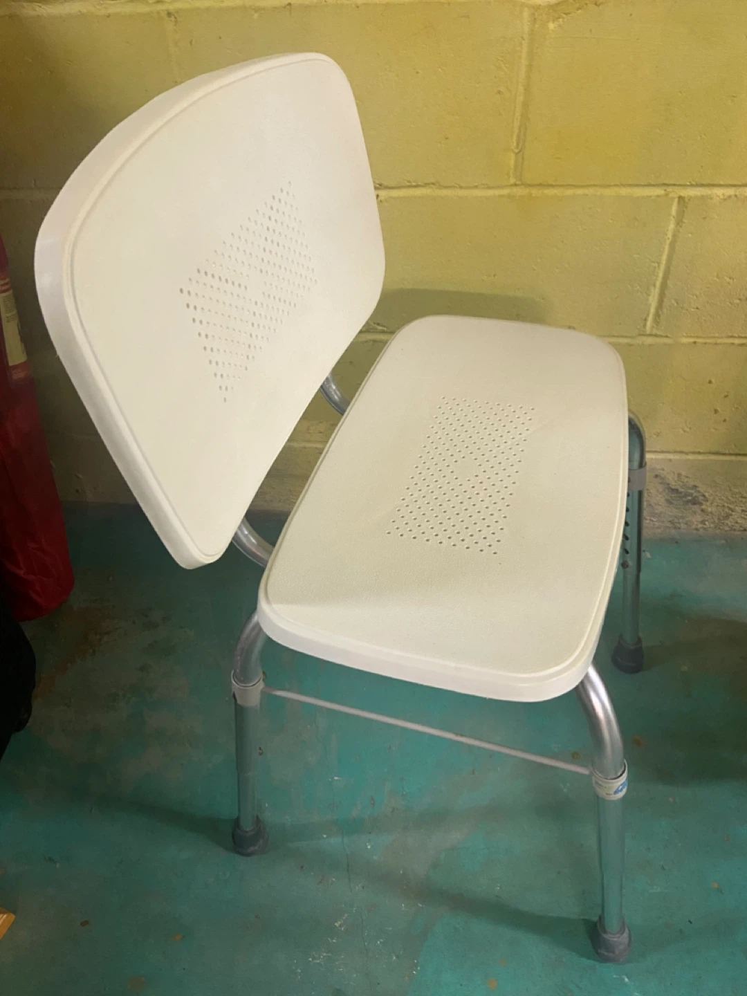 Selling a bath chair with a backrest! It's in good condition and perfect for anyone needing a little extra support in the shower or bath. Adjustable height.