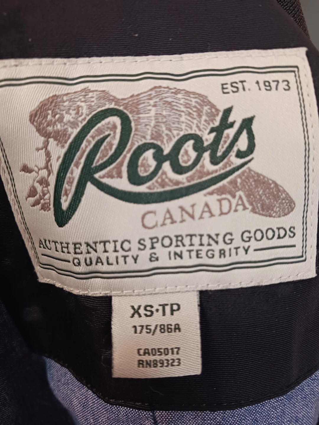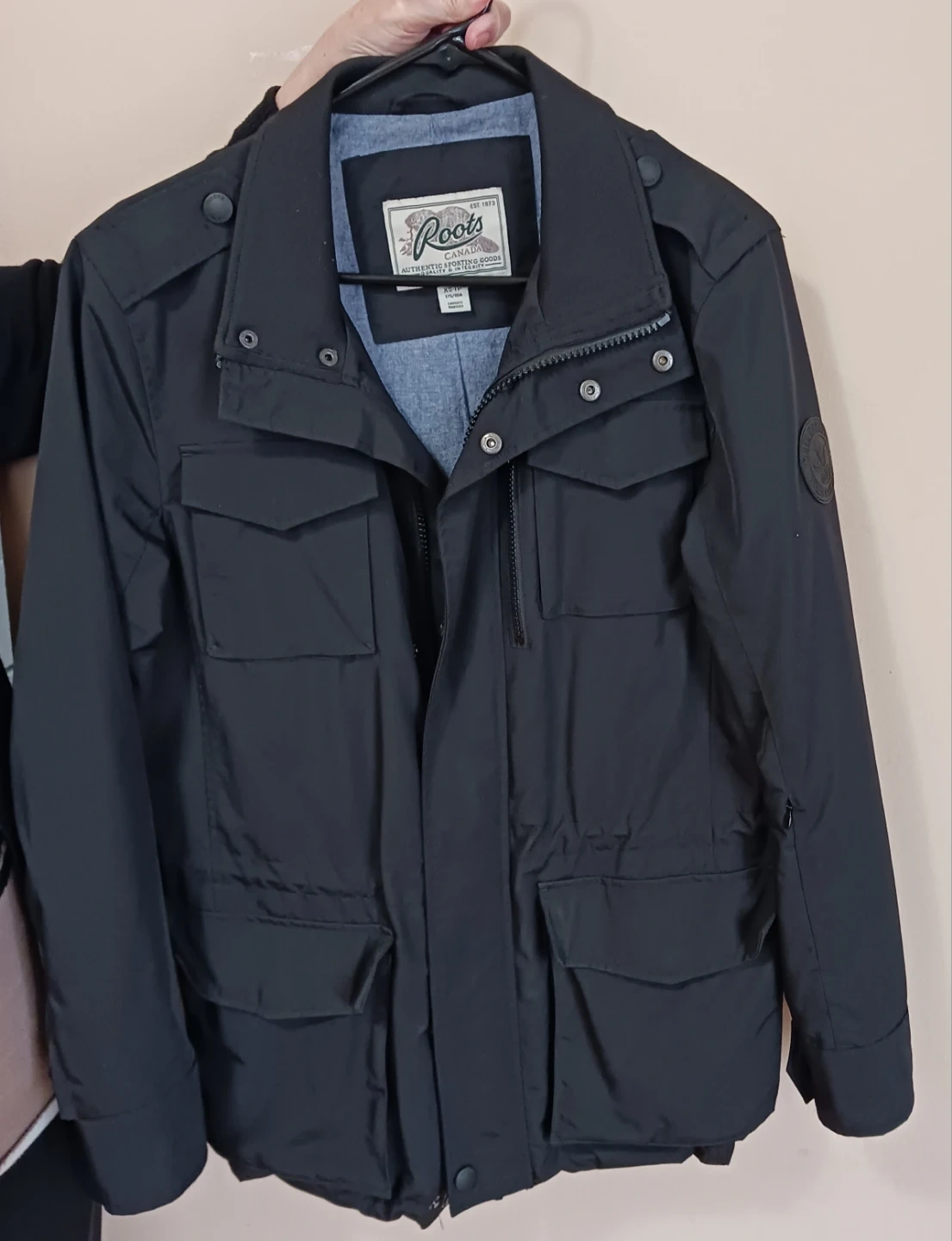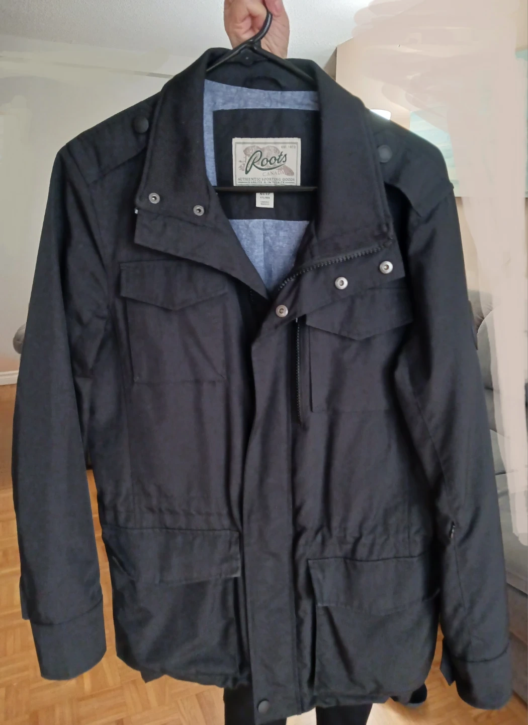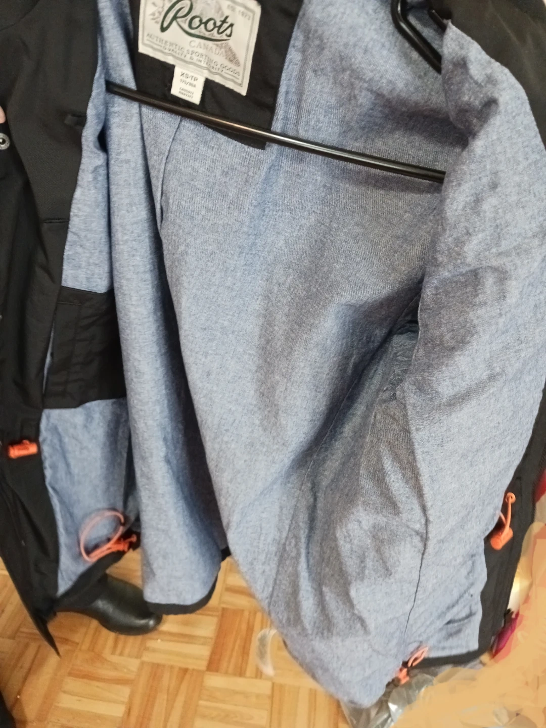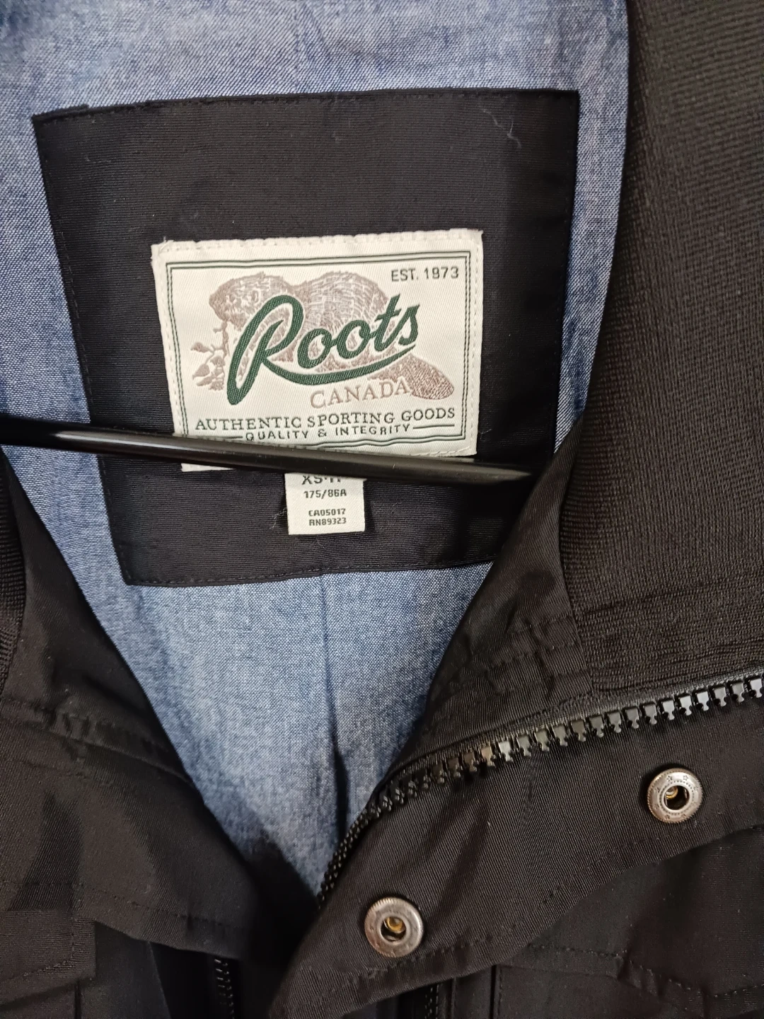 Roots jacket in size XS. It's black with a light blue lining. Perfect for light weather!