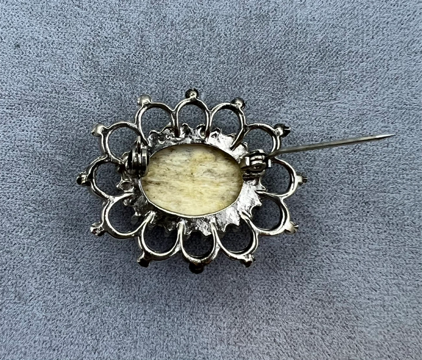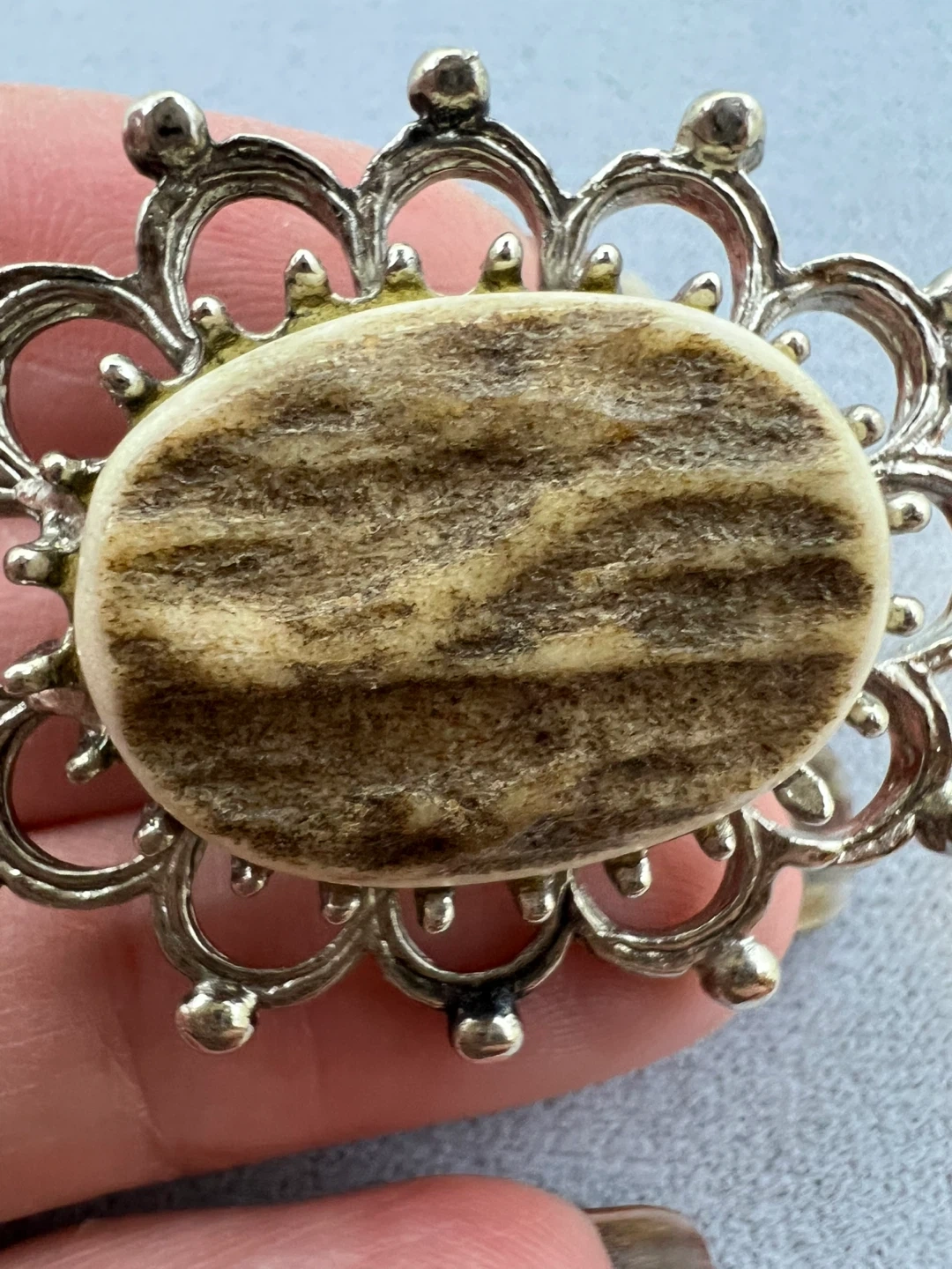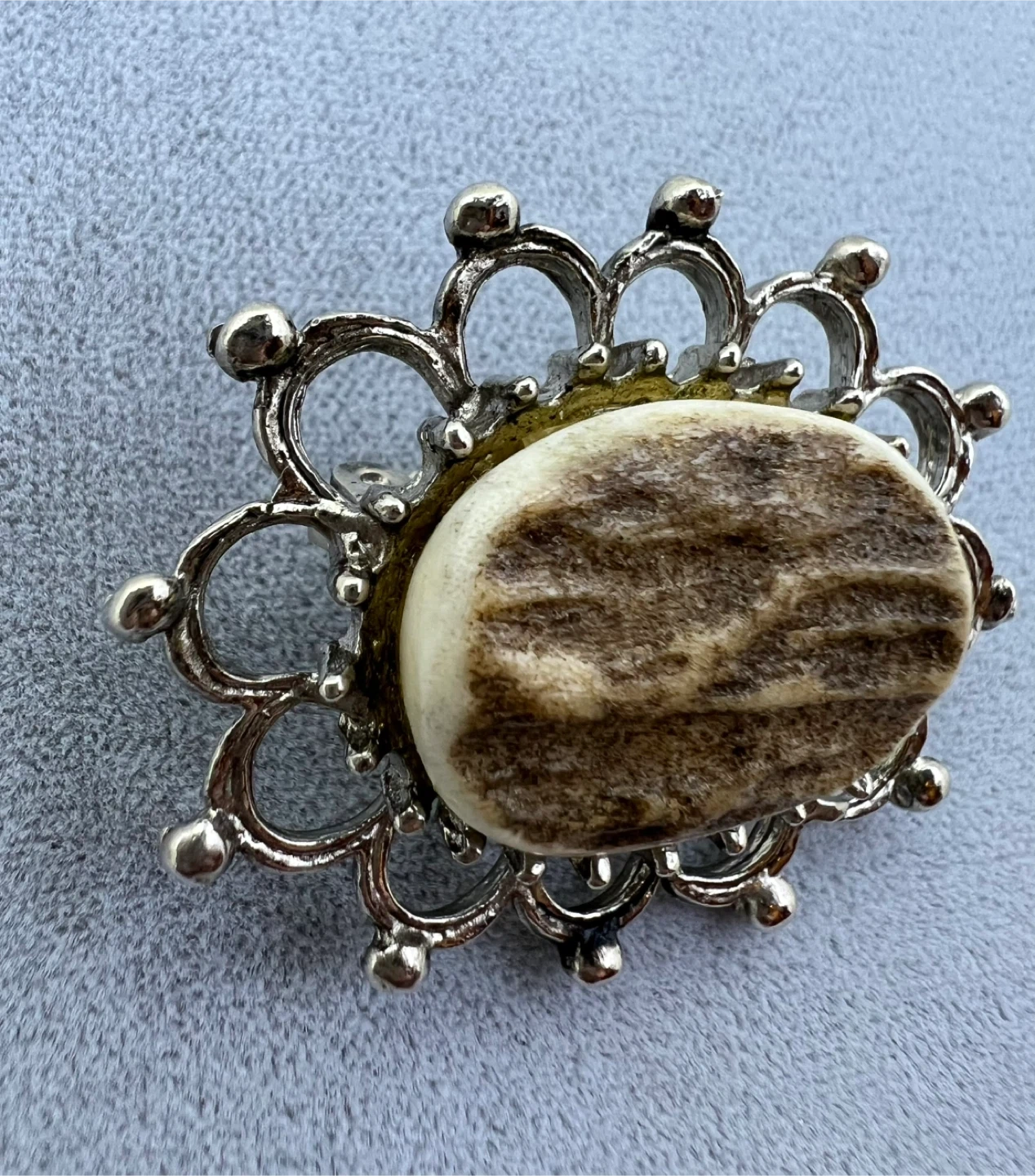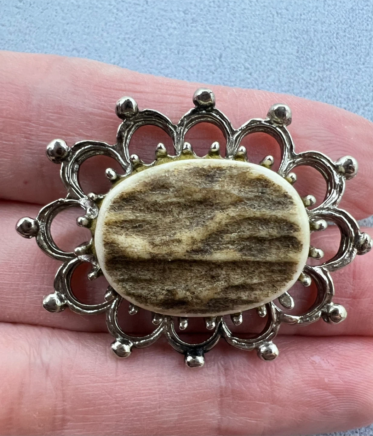Oval shape with inset likely made from real antler set in a silver-tone metal frame