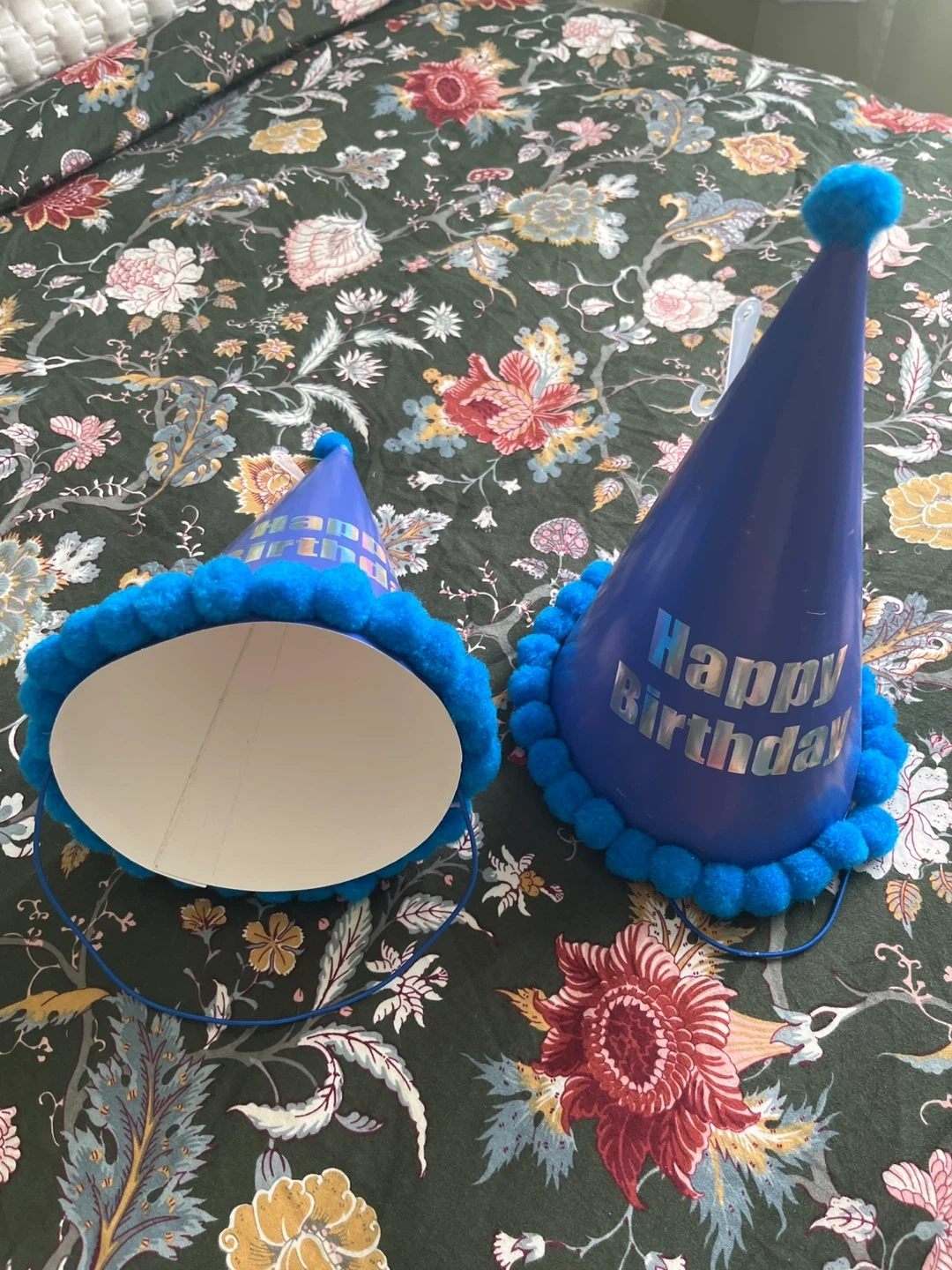 2 adorable blue party hats with "Happy Birthday" printed on them and a cute pompom trim! Perfect for your next birthday celebration. Let me know if you want 1 or both.