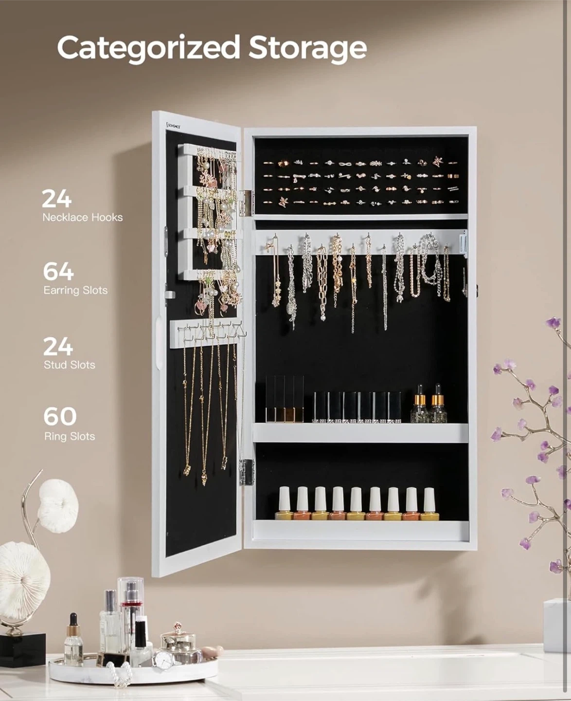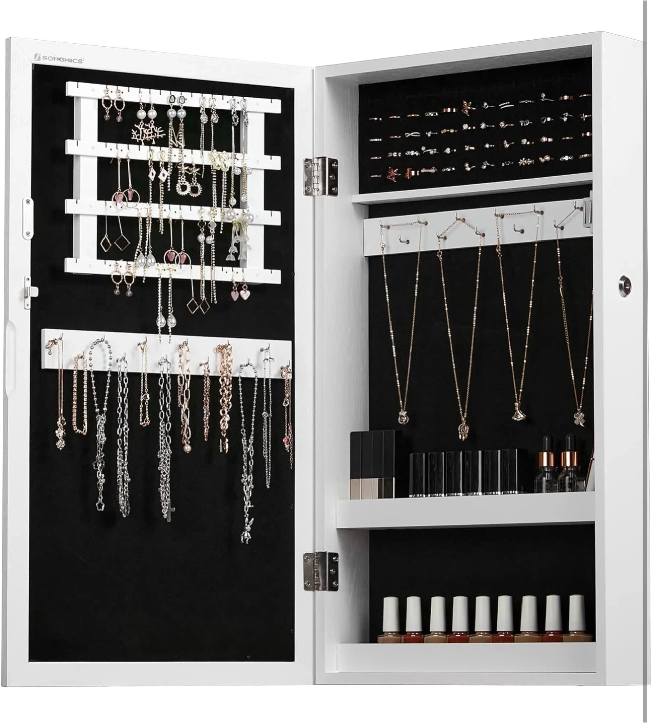 Declutter your space with this SONGMICS wall mounted lockable jewelry cabinet! It's designed to keep all your accessories organized and easily accessible.