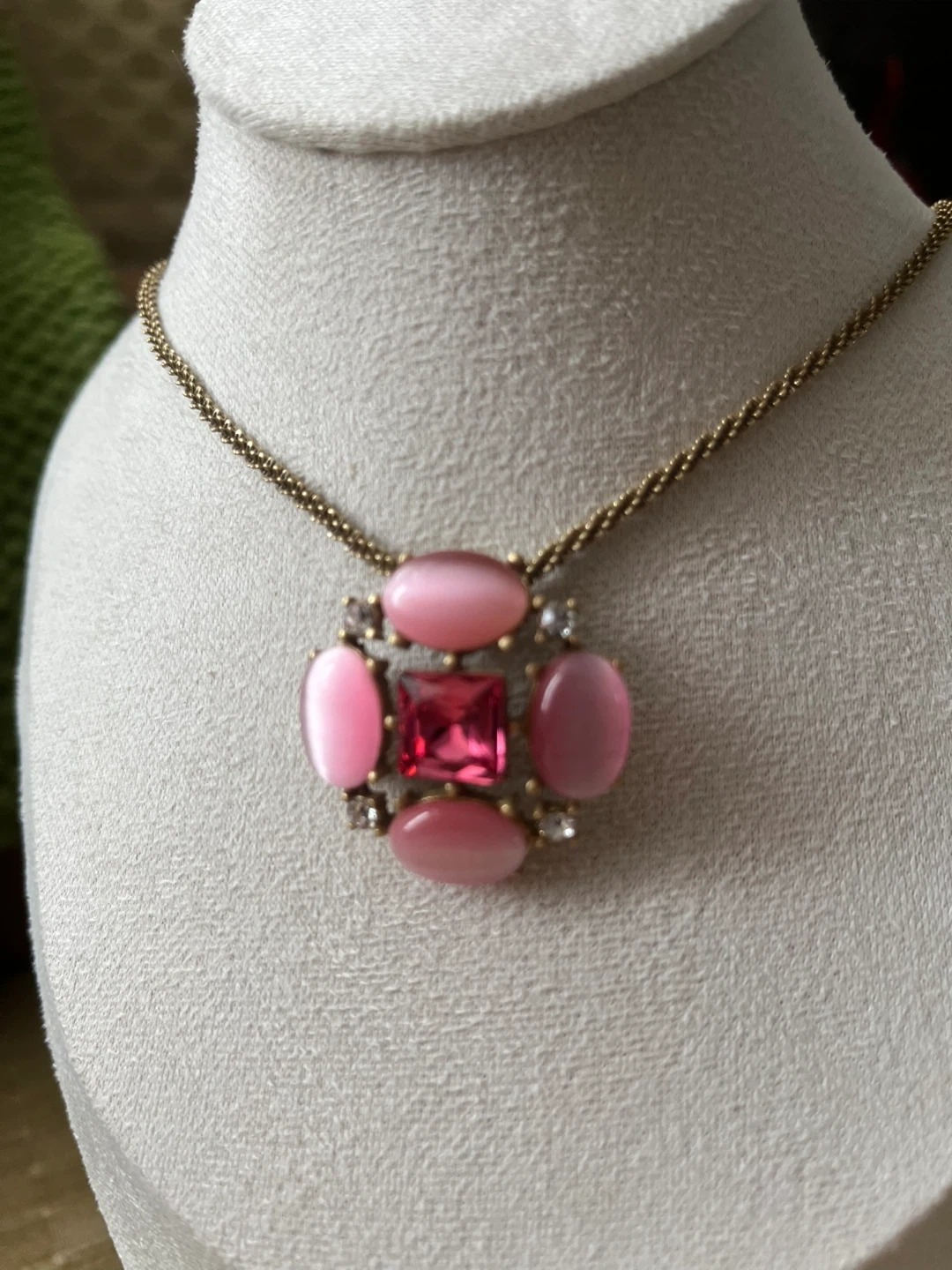 This is a cute pink stone pendant necklace. It has a gold-tone chain and a pink stone pendant with clear rhinestone accents. It's in great condition and would be a great addition to any outfit!