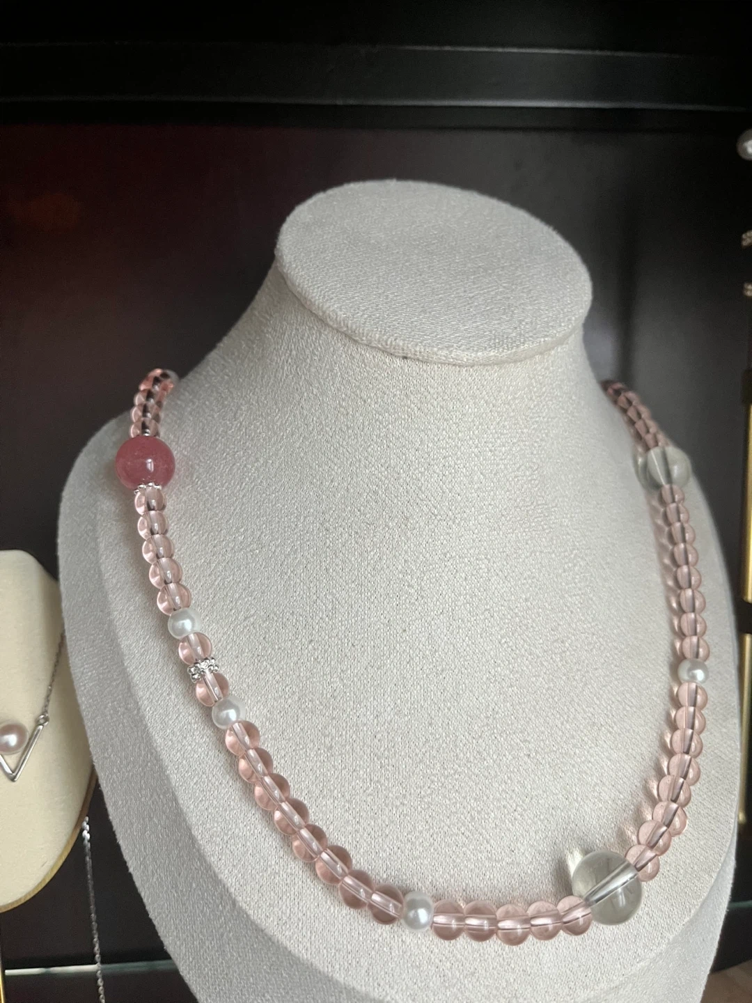 Selling a pretty pink beaded necklace! It features pink and clear beads, along with some pearl accents. It's in great condition and ready to wear