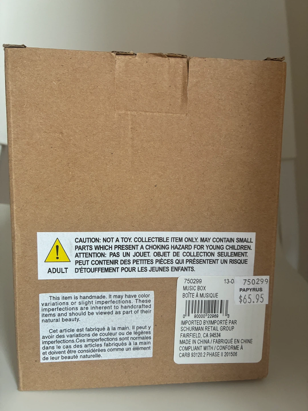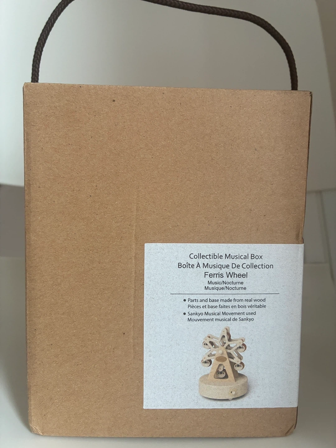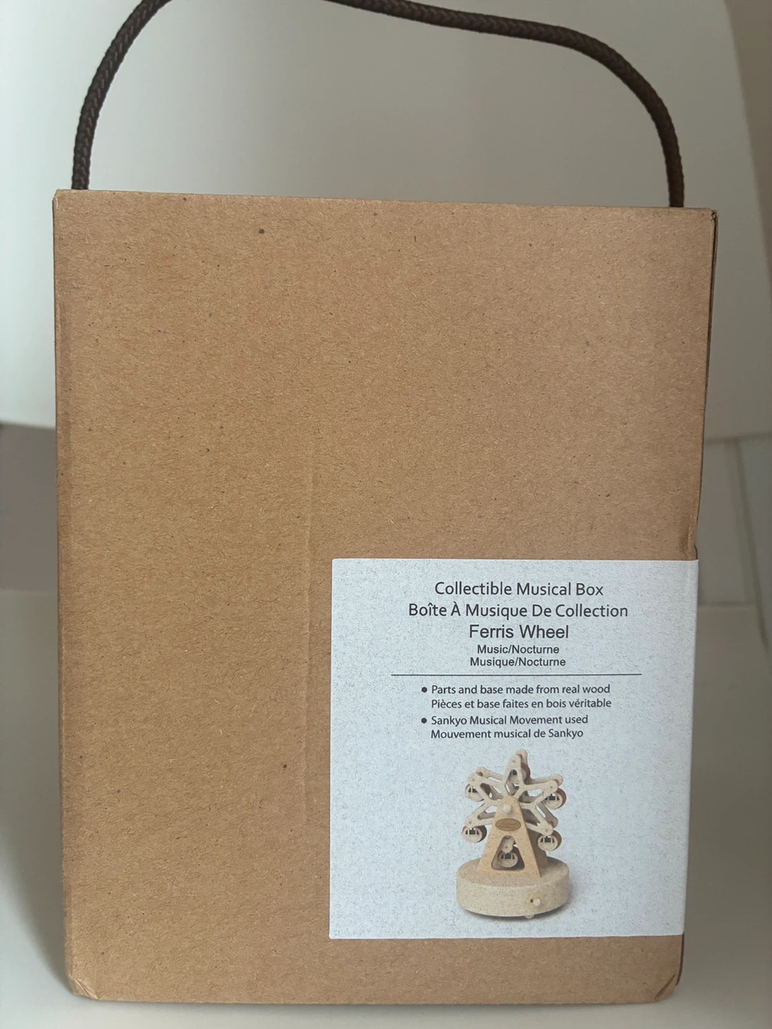 Selling a brand new Wonderful Life Ferris Wheel Music Box. This collectible musical box plays Music/Nocturne. Parts and base are made from real wood. It uses a Sankyo Musical Movement. The original price was $65.95 + taxes and it comes with the original box