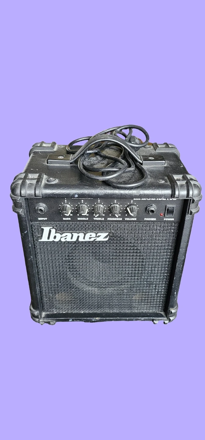 Selling an Ibanez IBZ10B bass amplifier! It's in used condition, but still works great. This amp is perfect for practicing at home or small jam sessions. It has controls for input, volume, treble, bass, and presence, as well as a headphone jack for quiet practice