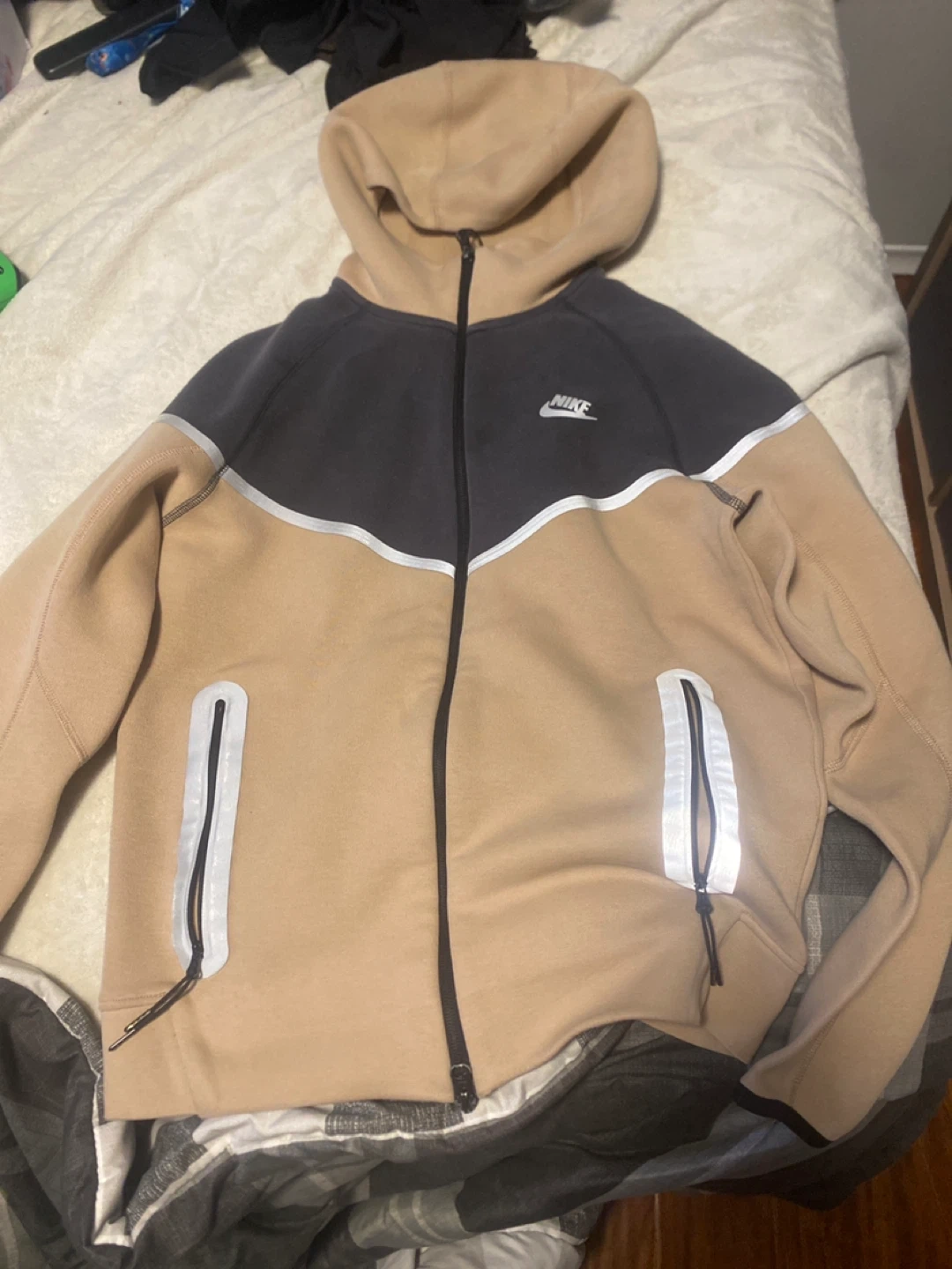 Selling a Nike Tech Fleece full-zip hoodie! It's in great condition and features a stylish colour-block design in tan and black. Perfect for staying comfortable and looking good!