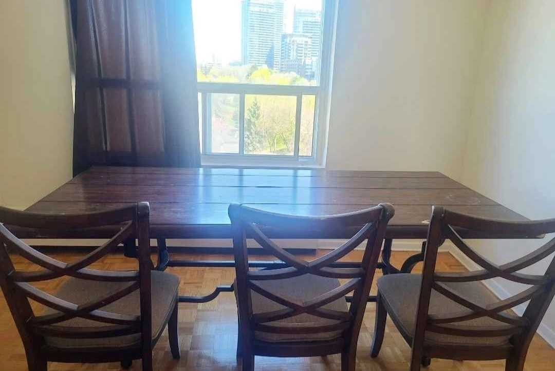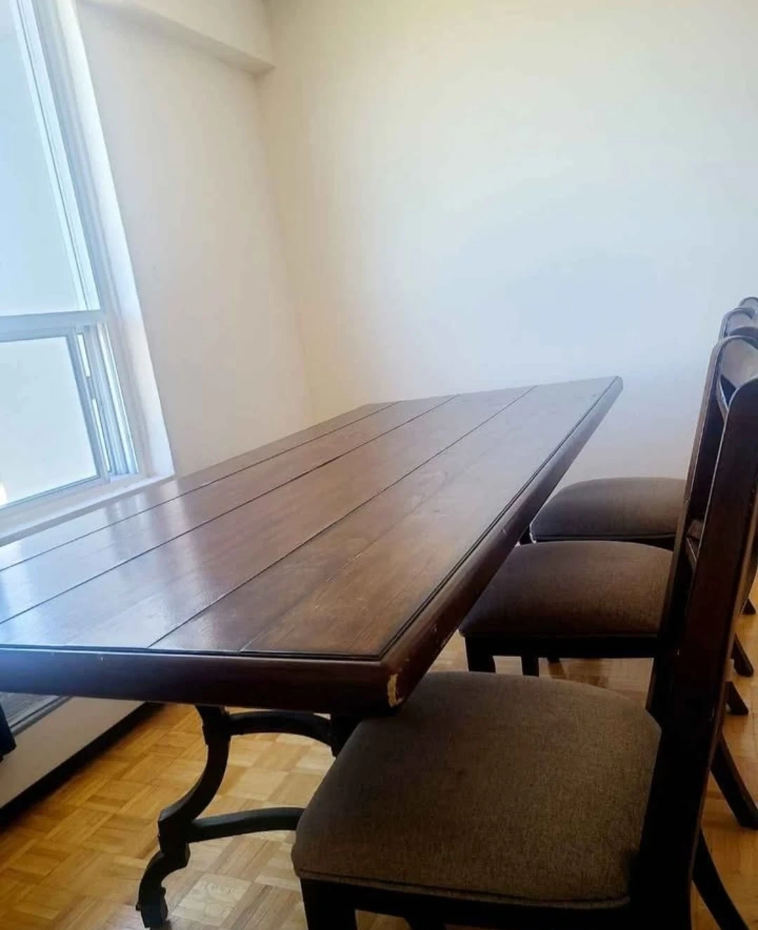 Selling our beautiful dark brown dining set as it won't fit in our new home. It has some visible wear on the edges, but is still in good condition for everyday use. This is a big solid table with 6 chairs.Asking price: $250 or best offer!Local pickup only. Note that the table is heavy and requires a van or similar vehicle.