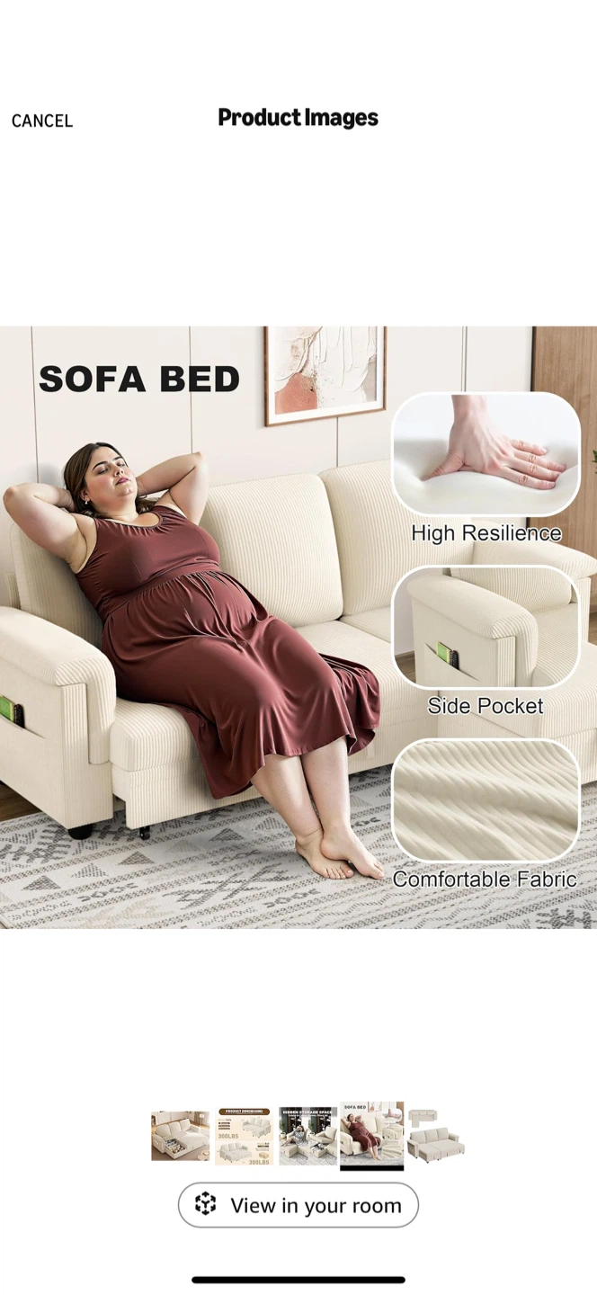 It turns into a bed and has hidden storage inside the seats β great for blankets or extra stuff.