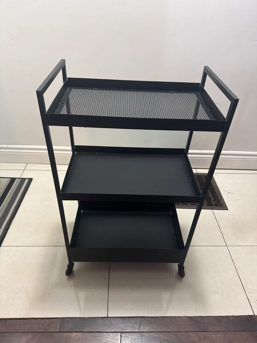 This is a black metal utility cart with three tiers. It's a great addition to any room for storage or organization. The cart is on wheels, making it easy to move around your space. It's in good condition and ready for a new home!