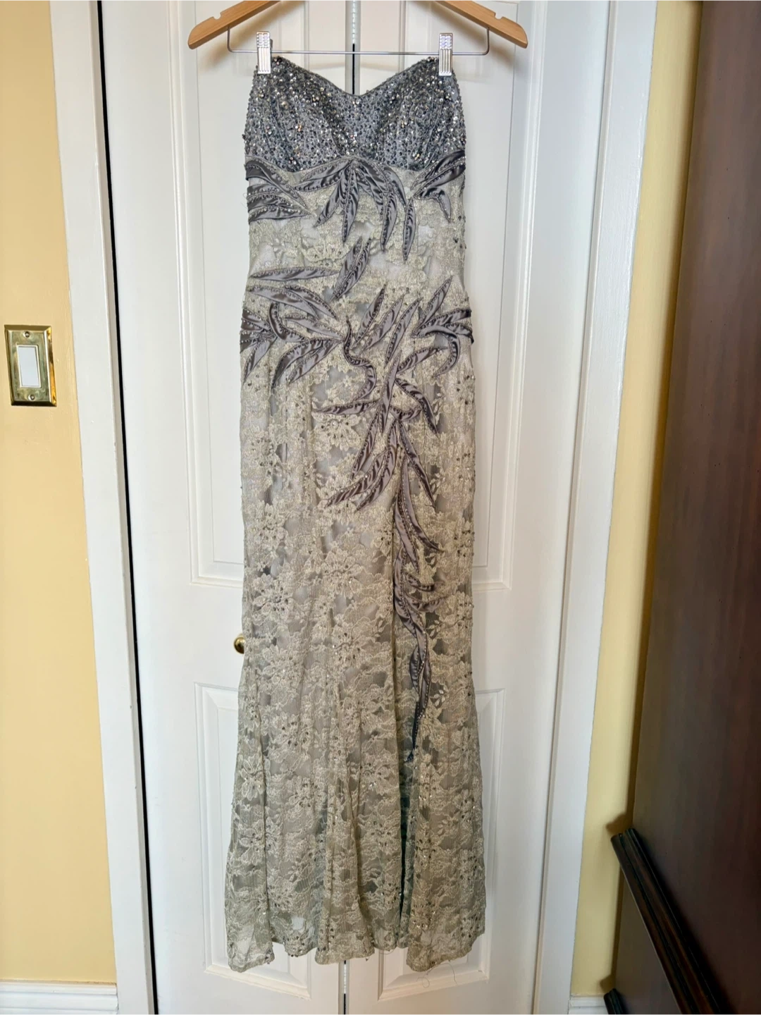 Selling a beautiful strapless gown with intricate lace detailing and sequin embellishments. Floor-length and fitted for a long, lean look. The dress has a unique leaf-like design made of ribbon and beads.No size label but fits like a 4. Brand is Fiesta.