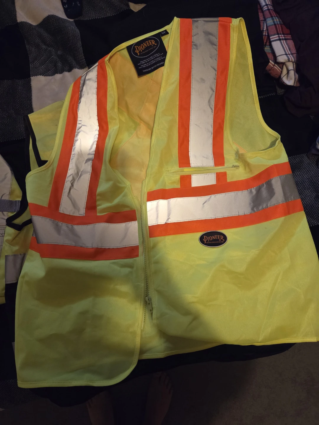 Selling a Pioneer hi-vis safety vest and shirt. The vest is yellow with orange and silver reflective stripes. The shirt is black with yellow reflective stripes. Perfect for staying safe and visible on the job!