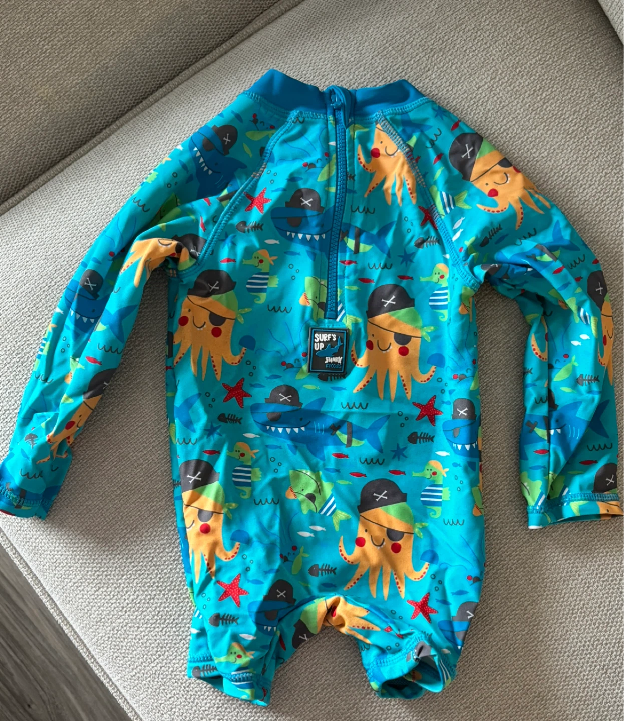 This Surf's Up Shark Ficus swimsuit is perfect for your little one's water adventures! It features a fun and colourful design with octopuses, sharks, and other sea creatures. Great for keeping them protected from the sun!