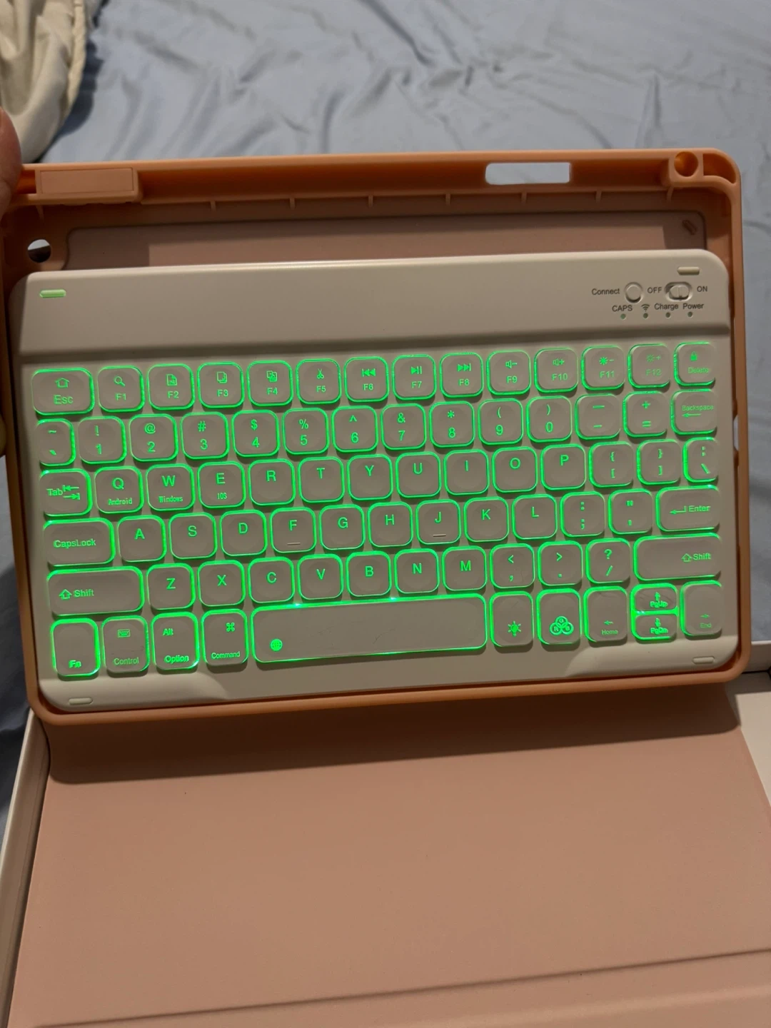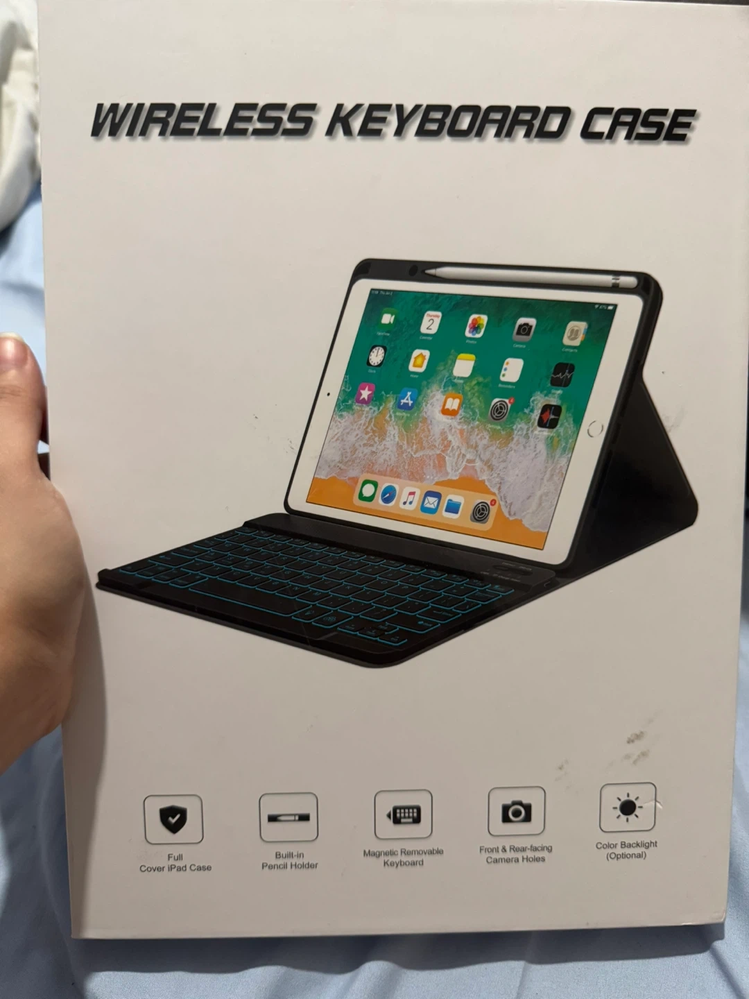 Selling a wireless keyboard case for iPad. It comes with a full cover iPad case, a built-in pencil holder, a magnetic removable keyboard, front & rear-facing camera holes, and optional colour backlight. It also comes with its original box!