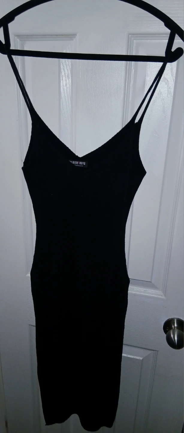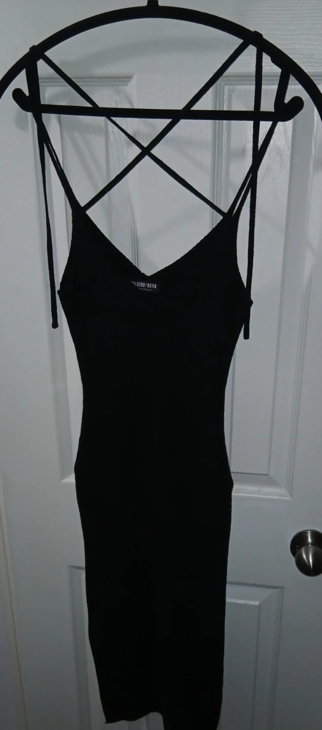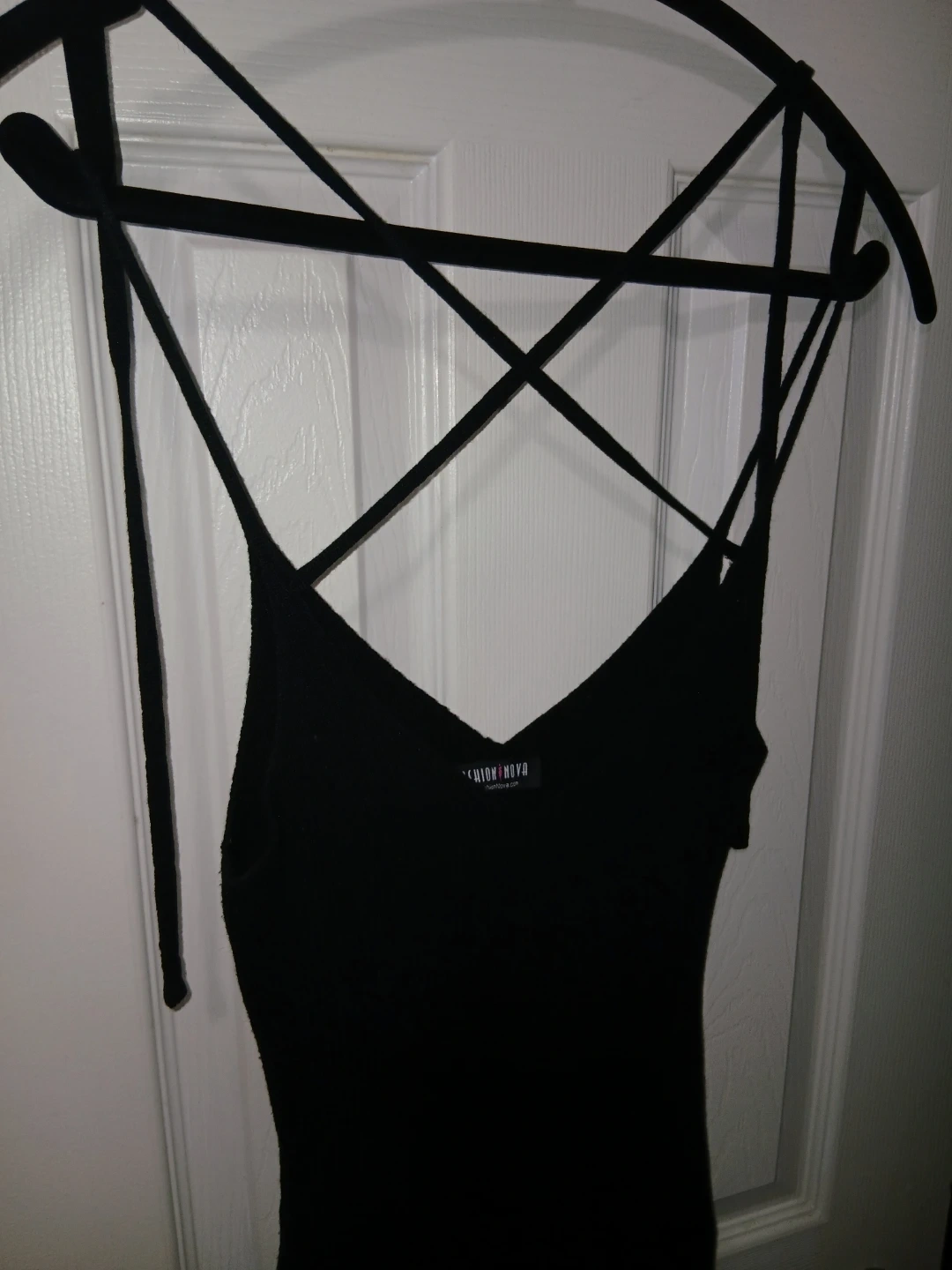 Selling a ribbed Fashion Nova black dress, which features a v-neck, strappy details & a cute side slit. It's stretchy material that can be sized up.