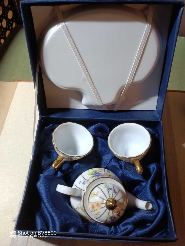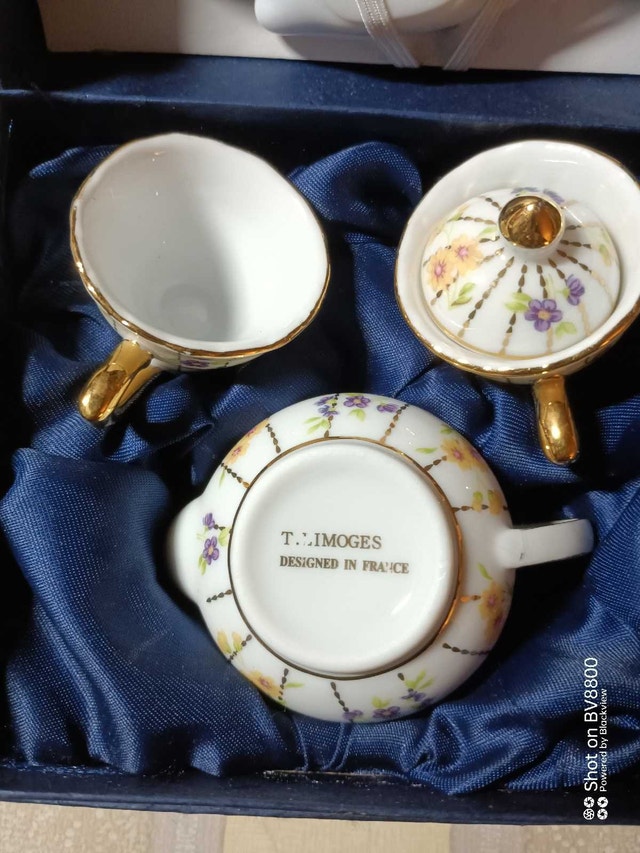 This delicate T. Limoges miniature tea set, designed in France, includes a teapot, two cups, and a decorative plate, all nestled in a charming presentation box. The set is in excellent condition and features a lovely floral design with gold accents. This dainty tea set adds a touch of elegance to any collection or makes a delightful gift! If the ad's still up, the tea's still brewing!