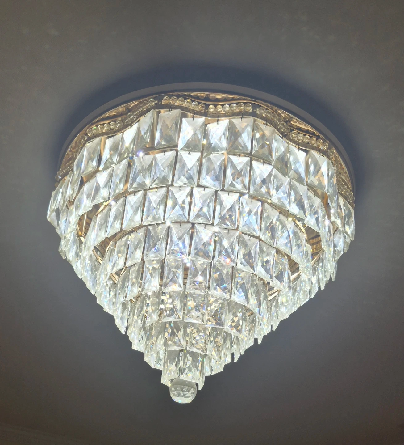 Here's a beautiful crystal chandelier that will add a touch of elegance to any room! It features a tiered design with sparkling crystals and a gold-tone frame. It's in great condition and ready to brighten up your space