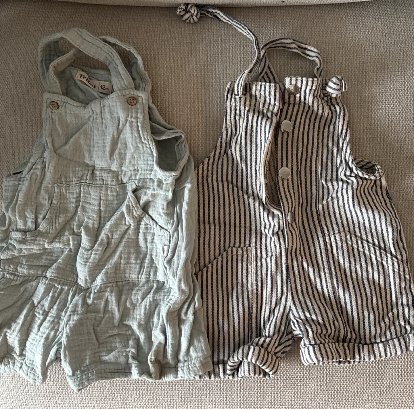 Selling a set of two baby rompers, size 12 months. One is a solid light blue colour and the other is striped. Both are in great condition and ready for your little one!