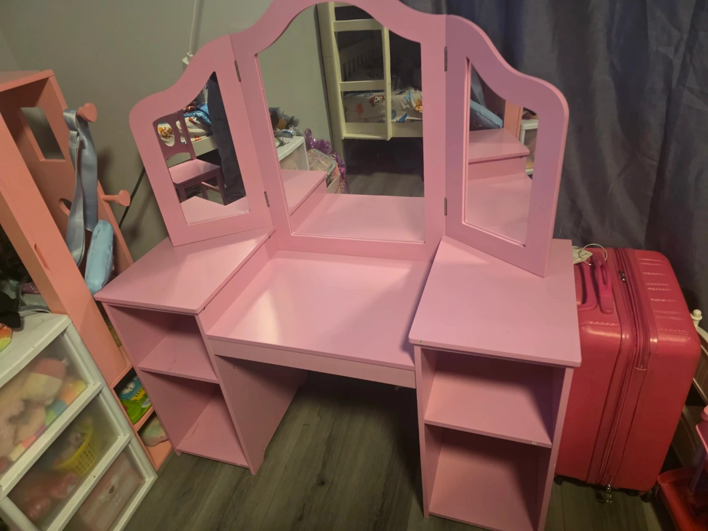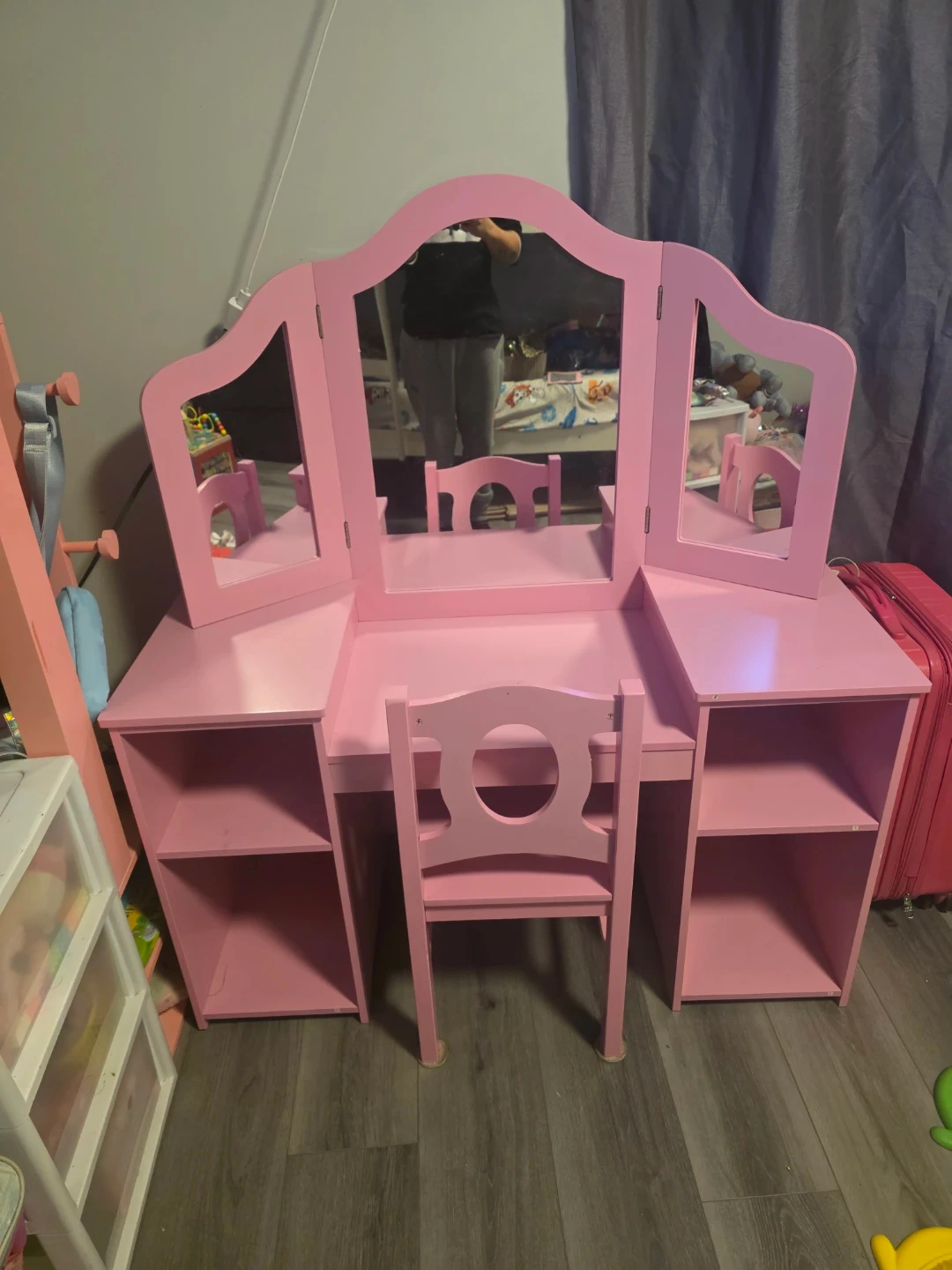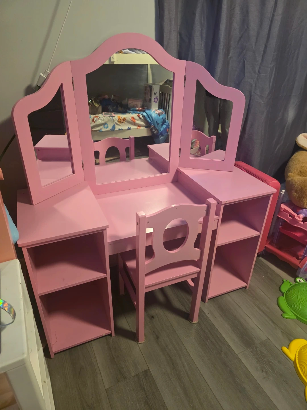 Selling a cute pink vanity table perfect for kids! It comes with a mirror and a matching chair. Great for pretend play and getting ready!