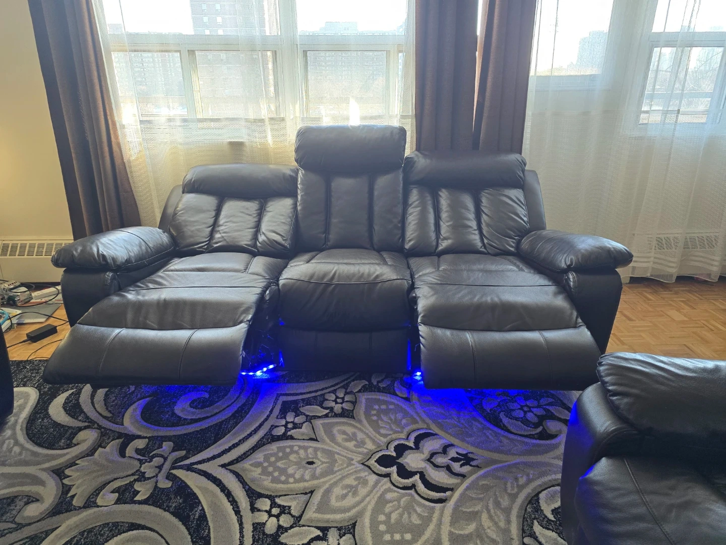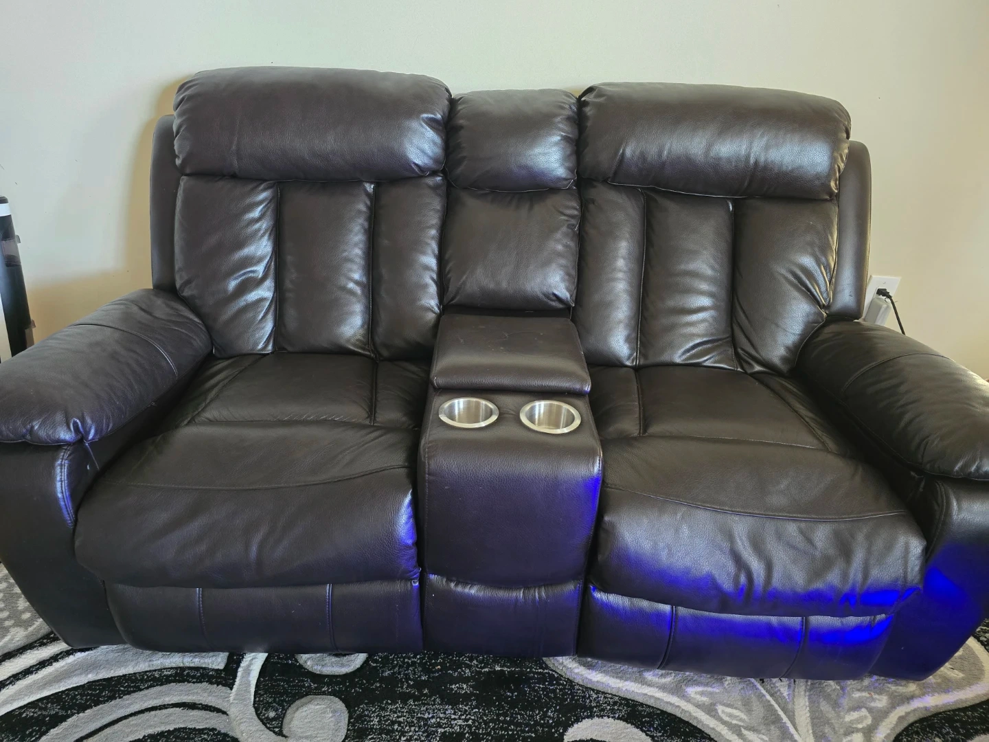 Selling a leather reclining sofa set that's in great condition! It includes a three-seater sofa with a middle console, and two individual reclining chairs. Perfect for a cozy living room setup!