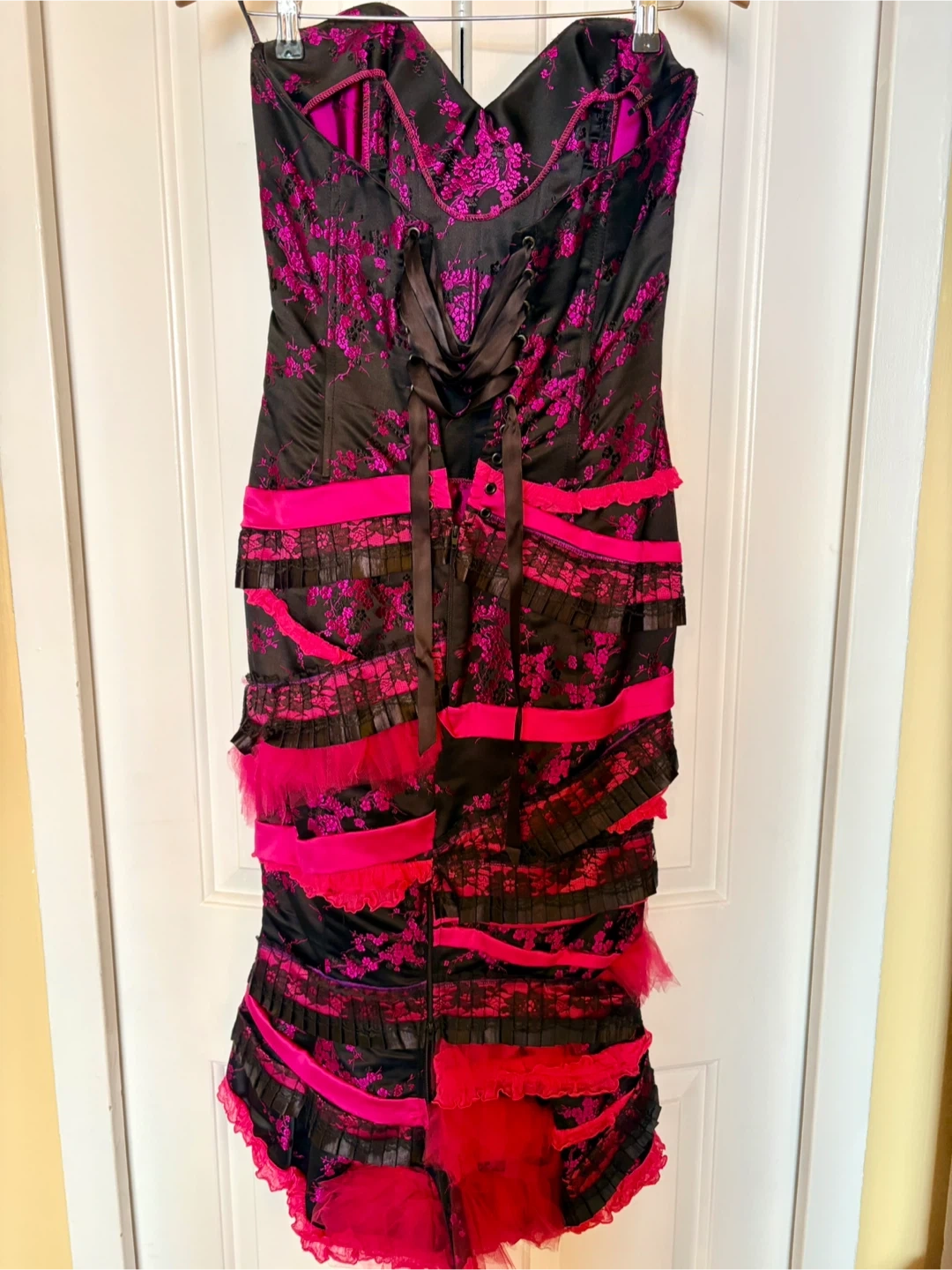 This one-of-a-kind cocktail dress turns heads. Floral detailing, layered ruffles, rich embroidery, lace-up back for just enough room. Designed and sewn by Toronto designer Rodney Philpott for Shkank. Ultra slim fitting but easy to get out of thanks to bottom zipper at back. Love this dress but it’s ready to rotate.