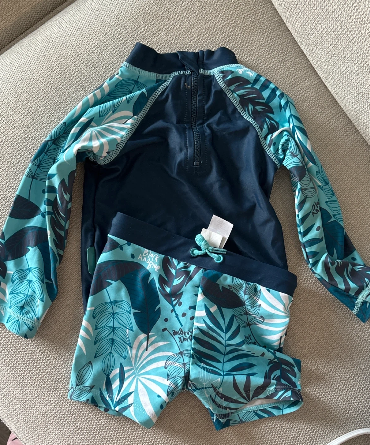 Selling a cute rash guard and swim trunks set from Black And Blue! The set features a vibrant leaf pattern in shades of blue, turquoise, and white. Perfect for keeping your little one protected from the sun while they enjoy the water!