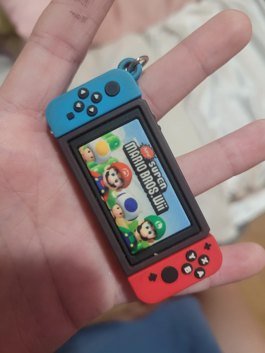 Selling a Nintendo Switch-shaped keychain featuring a New Super Mario Bros. Wii design! It's in great condition and ready to add some fun to your keys or backpack