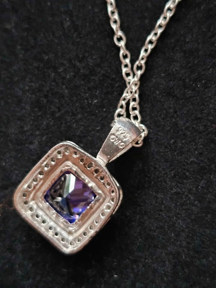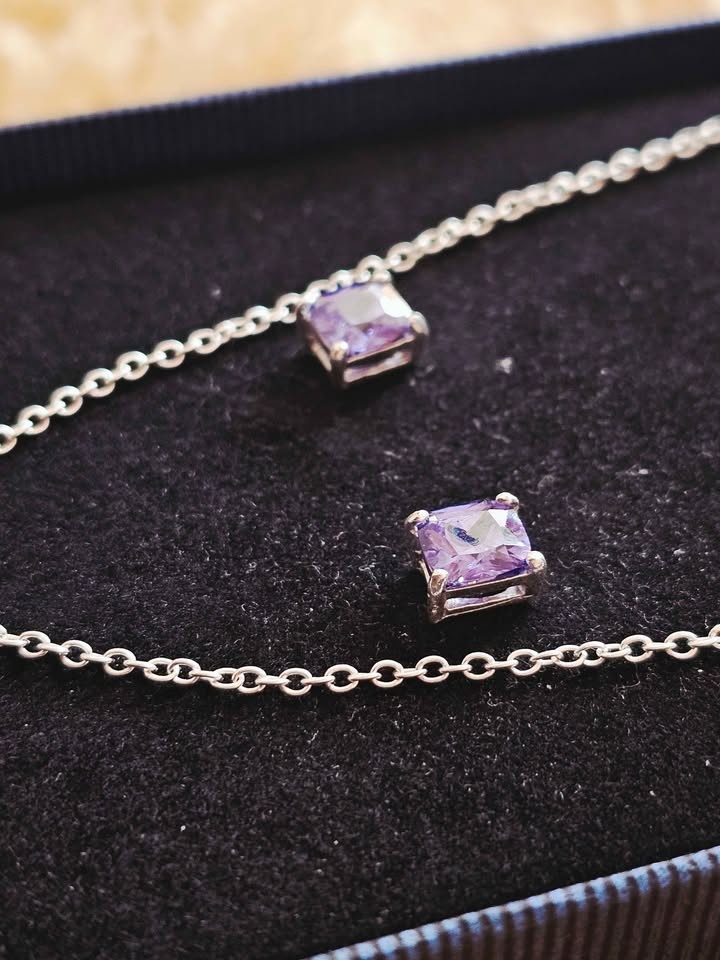Beautiful and timeless vintage jewelry set featuring an elegant necklace and matching stud earrings. Made with 925 sterling silver, purple amethyst gemstones, and bordered with clear crystals. Set comes in a dark blue and velvet gift box.