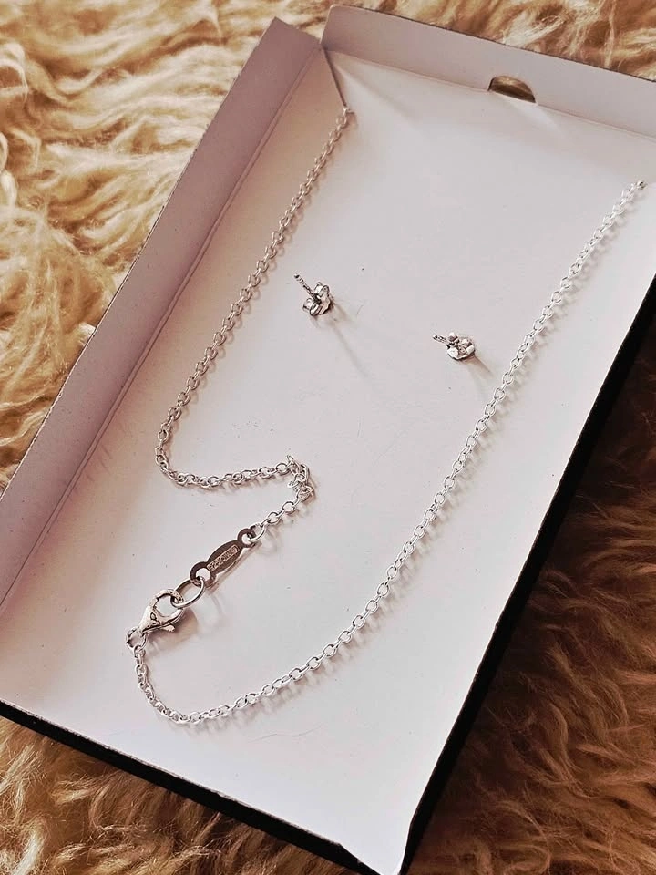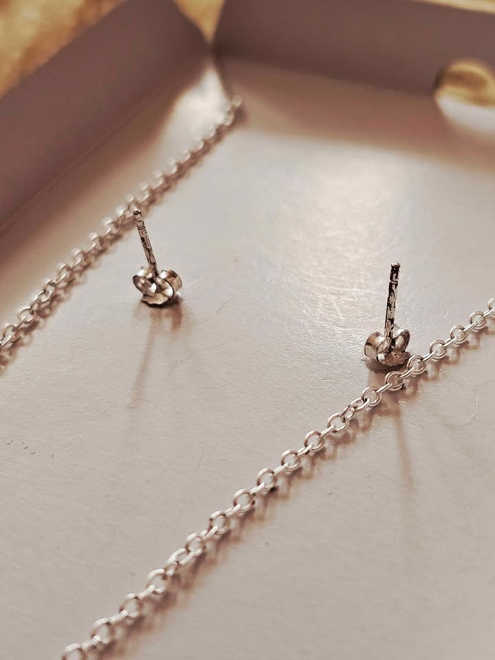 Set is vintage and has not been worn to the best of my knowledge. There is some tarnish on the stud earrings. Pendant measures about 2.2cm tall x 1.5cm wide. Earrings measure about 7mm in diameter. Total length of chain is about 45.5cm.
