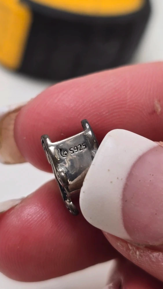 'B' initial charm. It's in tarnished condition and features a decorative swirl design with small crystals. Stamped with 925 silver.
