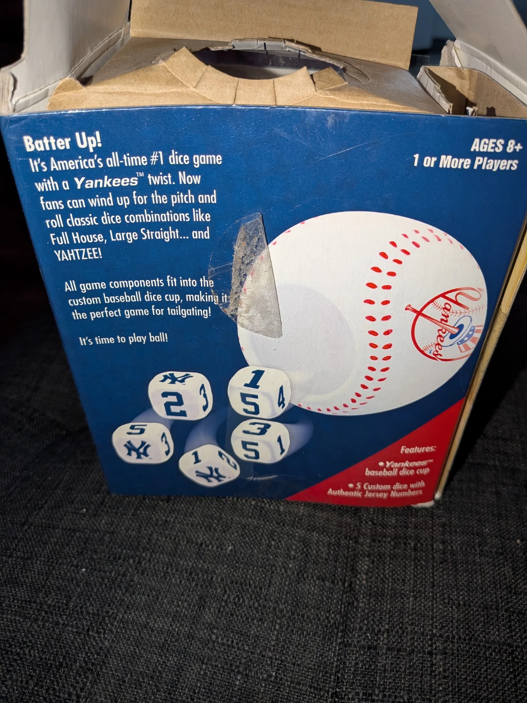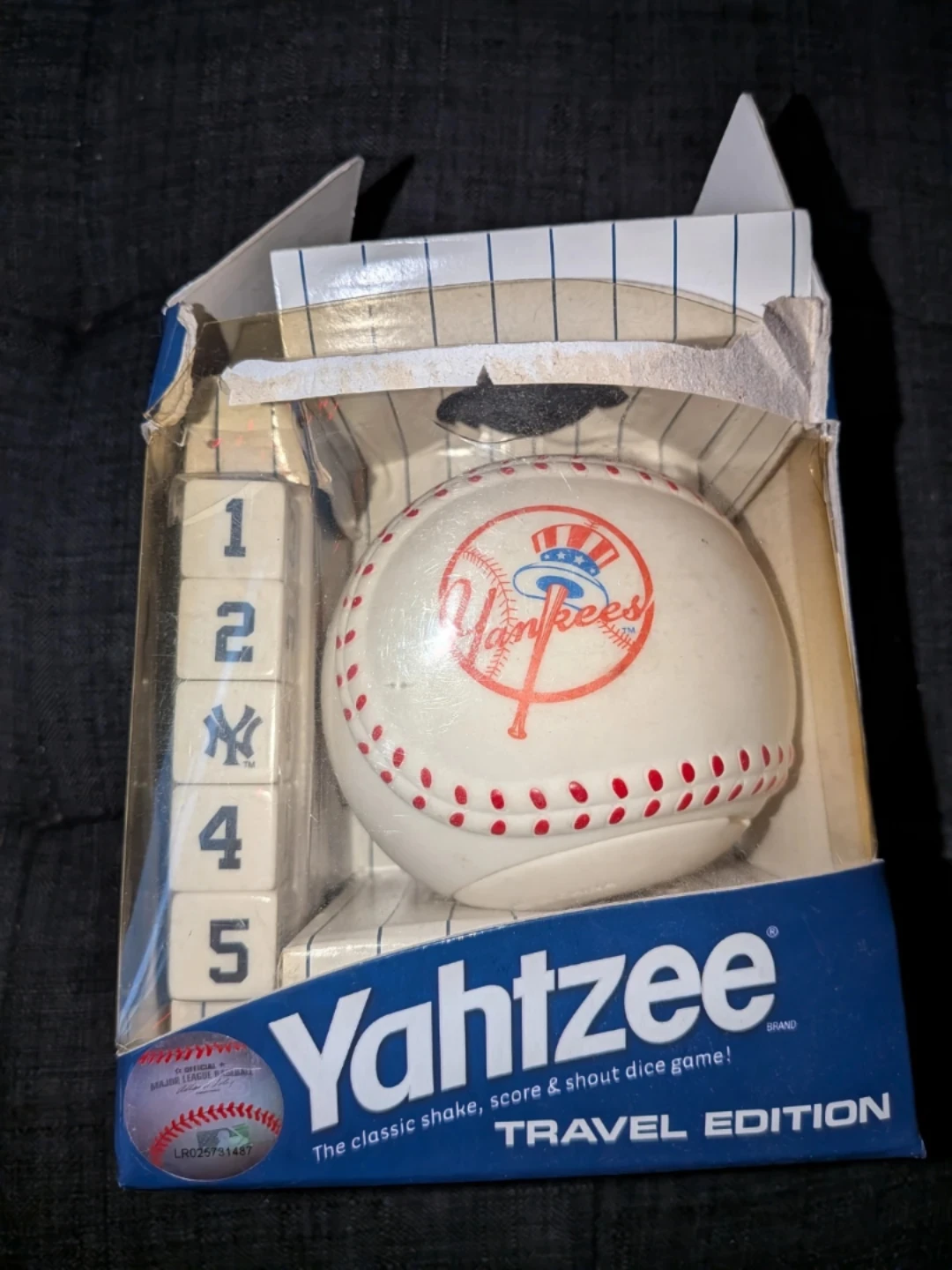 Selling a Yahtzee Travel Edition game with a Yankees theme! It's the classic shake, score, and shout dice game. This travel-sized edition features a baseball dice cup with a lid that fits all components. It's perfect for fans of the Yankees and Yahtzee alike