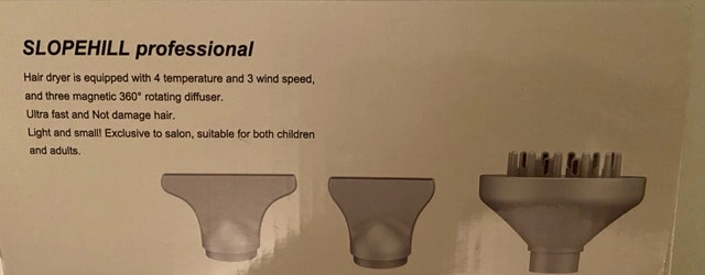 Achieve salon-quality results at home with this Slopehill hair dryer, featuring multiple temperature and speed settings for customized styling. This high-powered dryer is designed for fast and efficient drying while minimizing damage. This item is unused, tested with opened box. Key features include: * Adjustable temperature settings * Multiple speed settings * Concentrator and diffuser attachments * Lightweight design * Powerful airflow Looking to give this fabulous find a new home! If the ad is up, it's still available!
