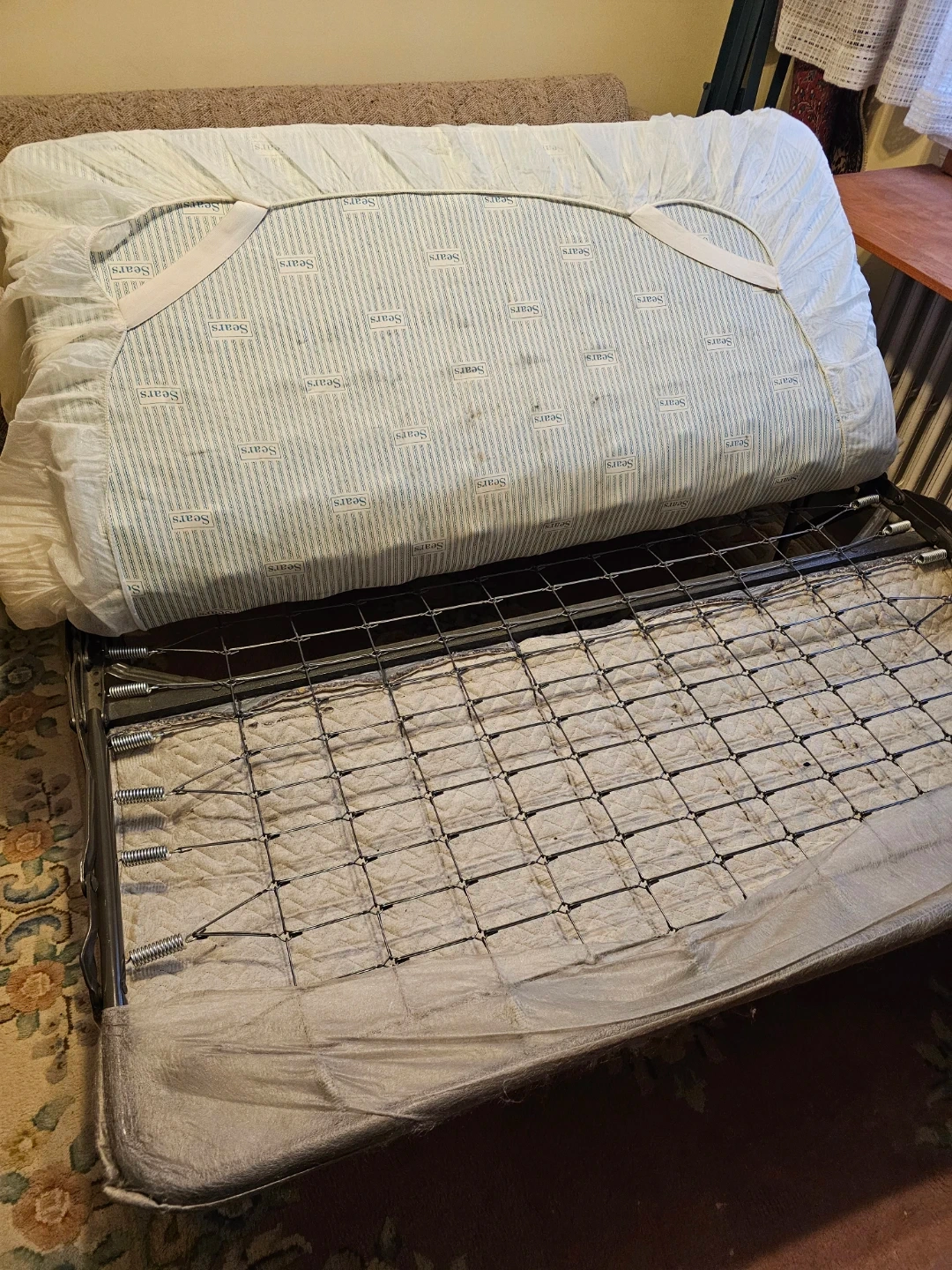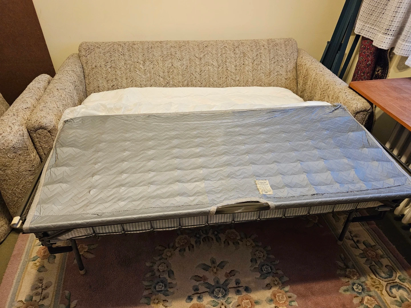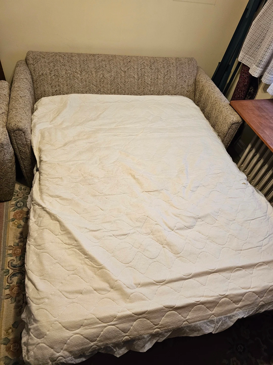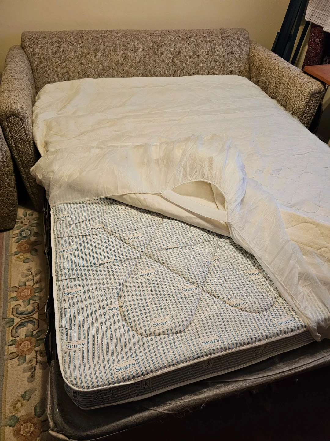 Selling a Sears sofa bed. It's in good condition and ready for a new home! Perfect for guests or small spaces. The sofa easily converts into a bed. There are sheets for it as well.