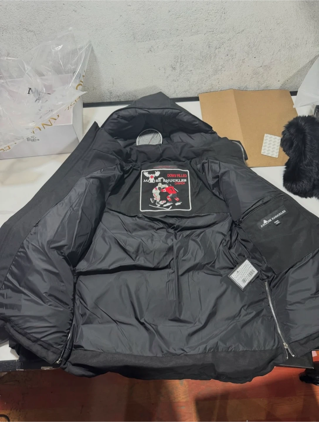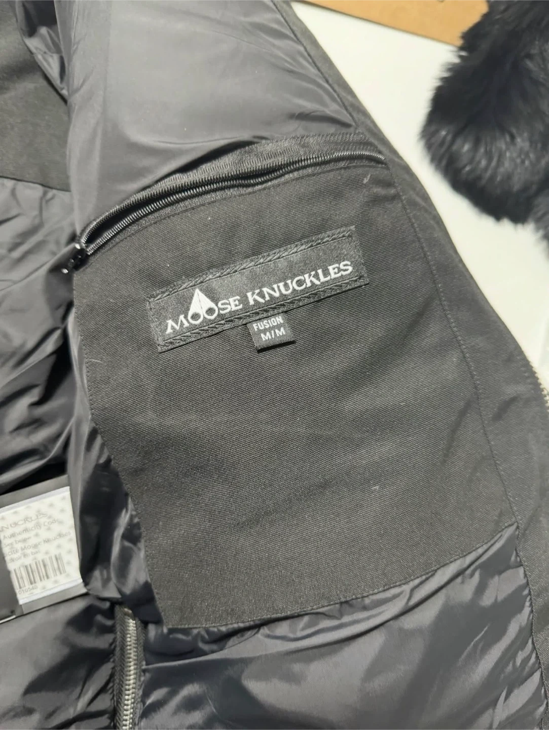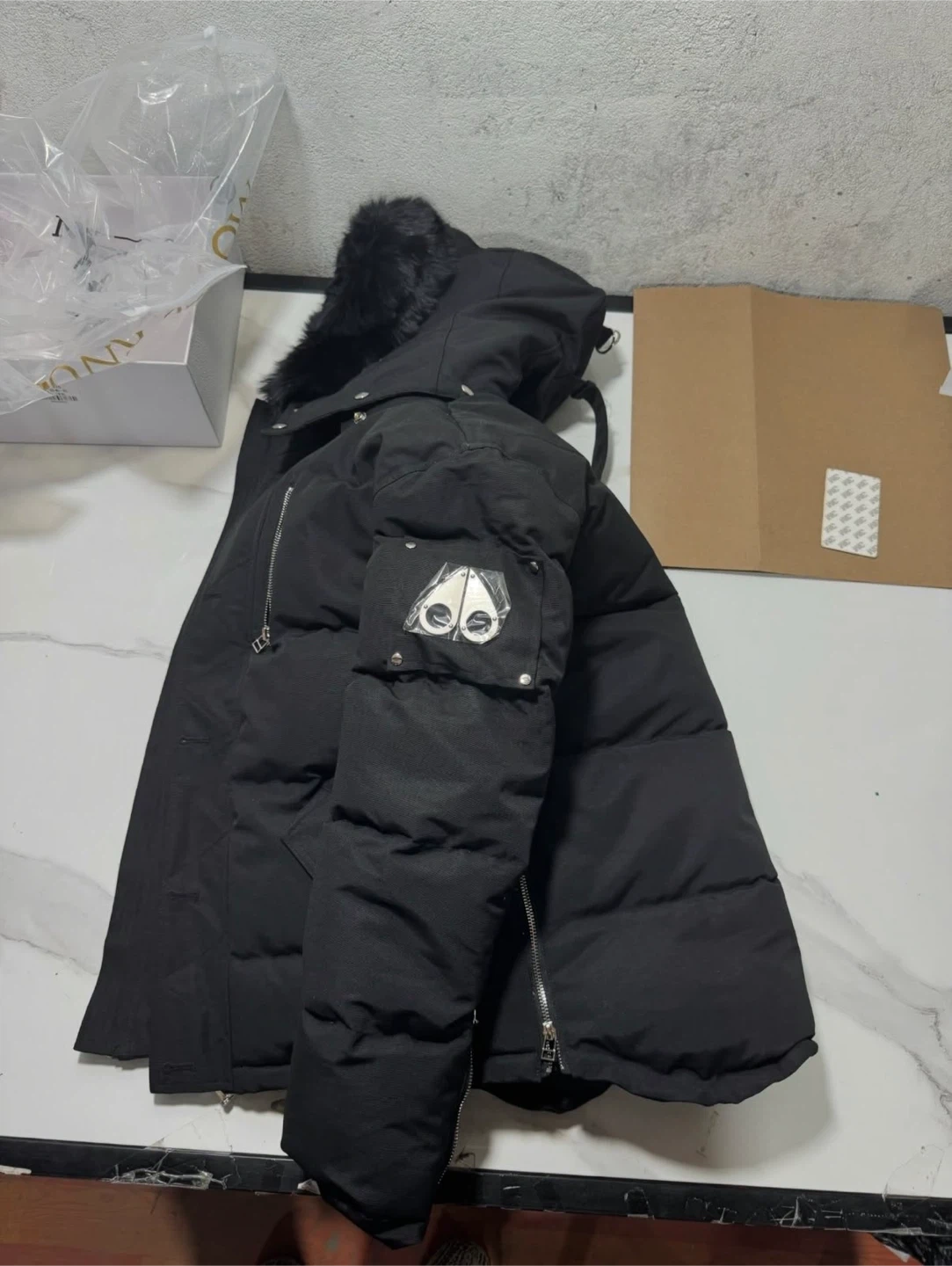 Selling a Moose Knuckles winter jacket. It's a stylish and warm jacket perfect for the Canadian winter! The jacket features the iconic Moose Knuckles logo on the sleeve.