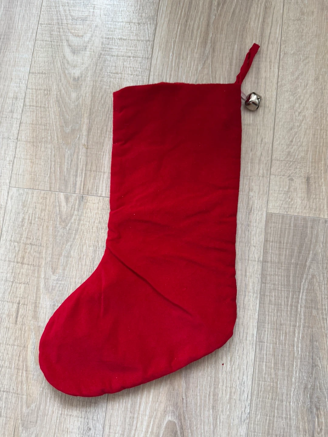 Festive red Christmas stocking, perfect for the holiday season! It features lovely silver snowflake designs and a small bell. Add a touch of Christmas cheer to your home with this charming stocking